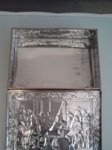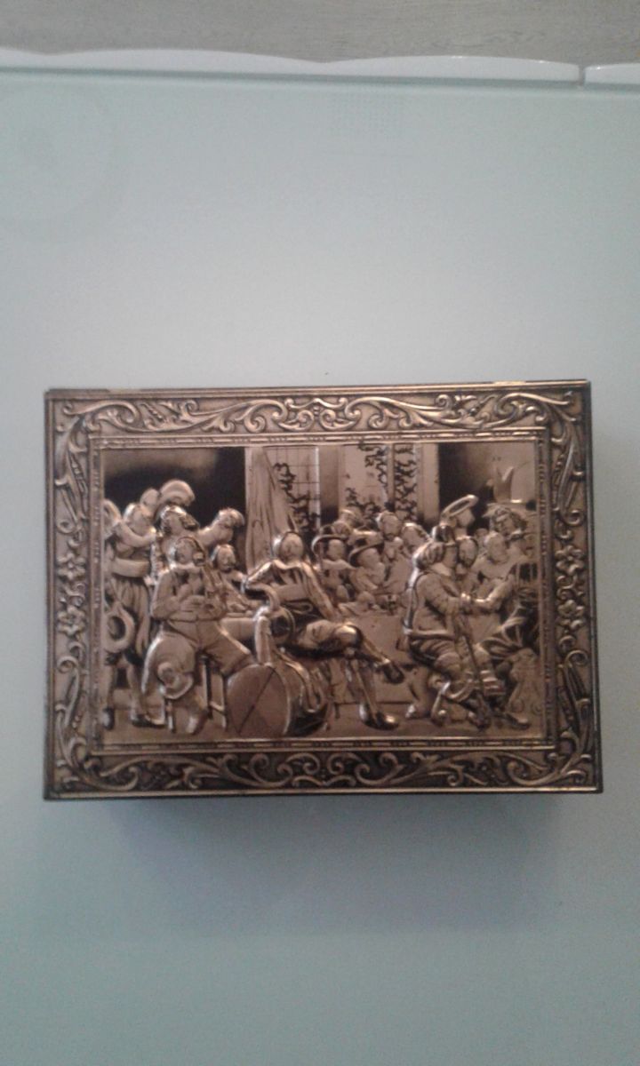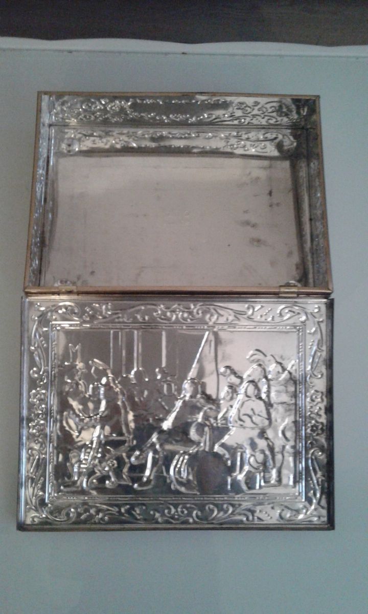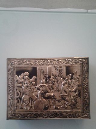 Boîte en métal d origine Belge, le décor de la boite est en relief il représente une peinture de l artiste B.Van der Helst intitulé le banquet de l Amsterdam, la boite est en bonne état.