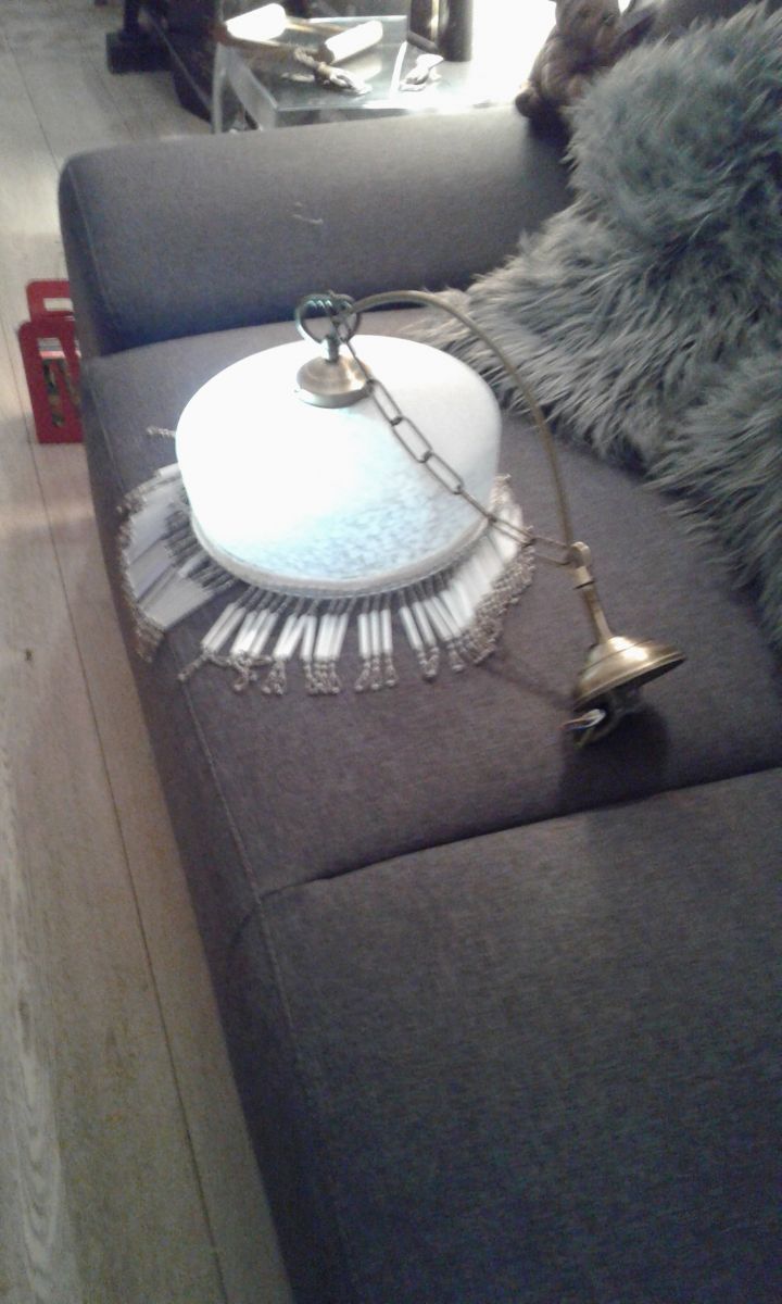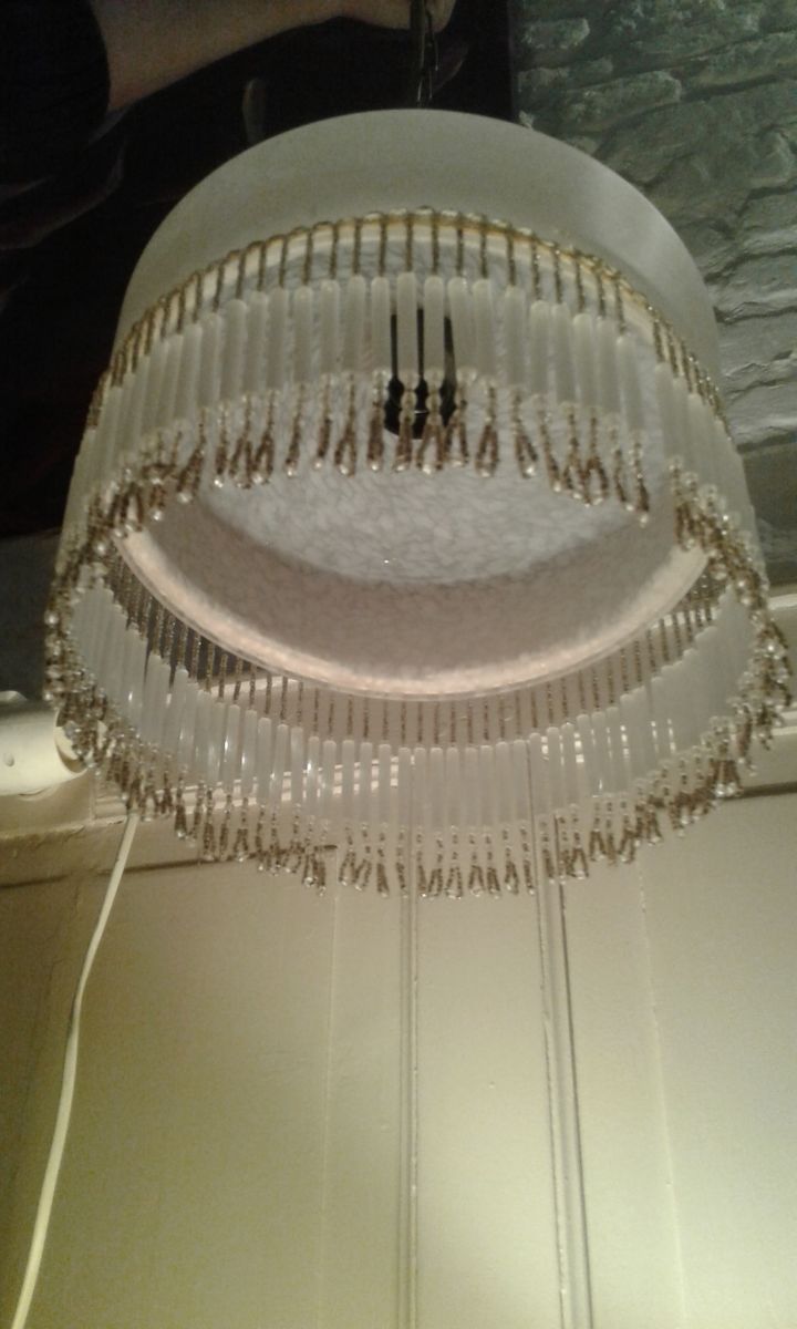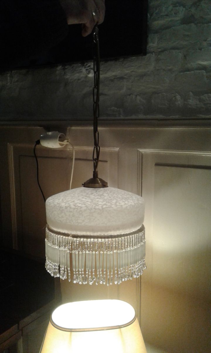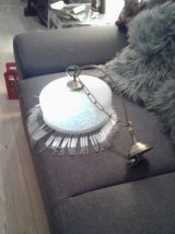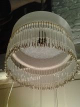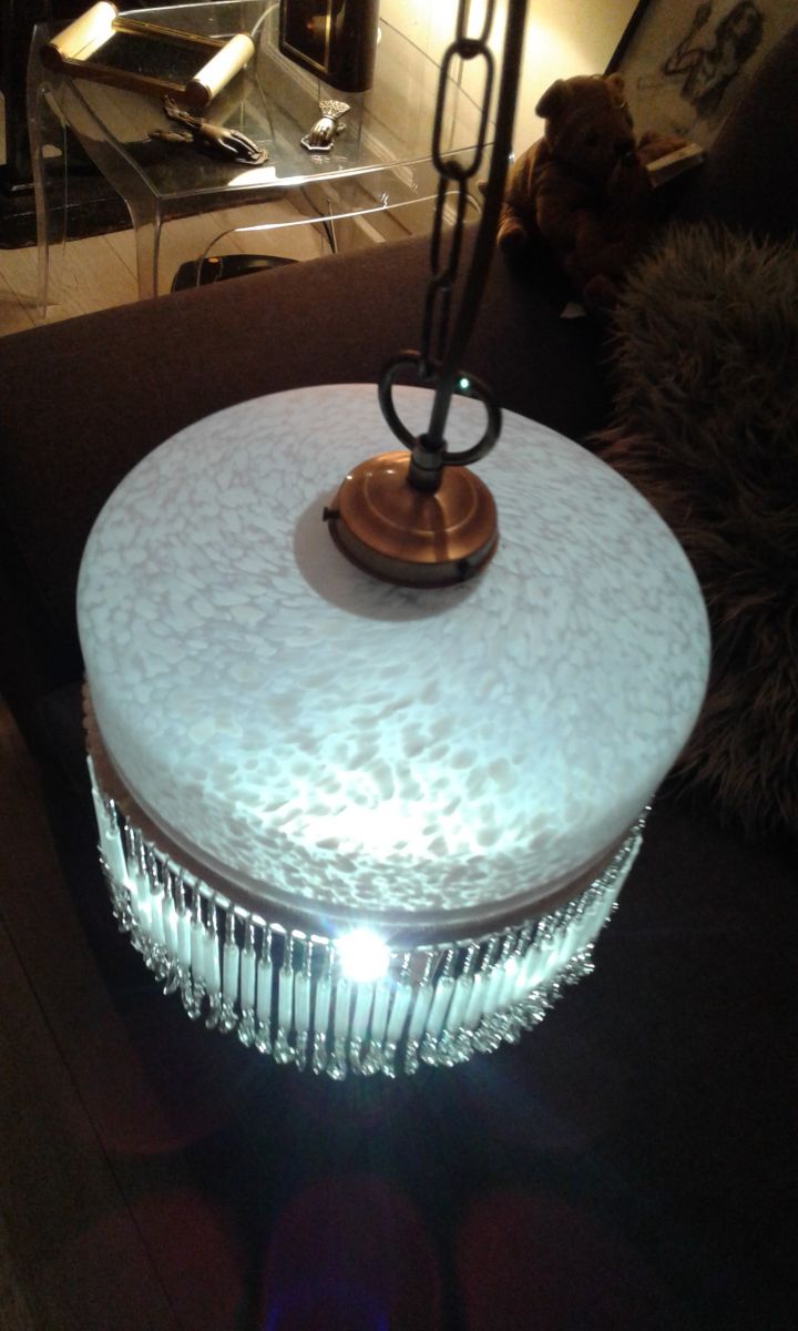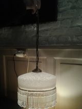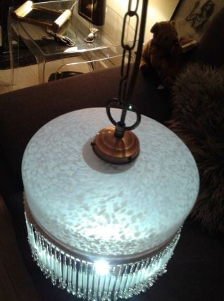 Suspension Art Déco en opaline nuancé vieux rose très claire et frange de perle , la rosace et la chaîne sont en laiton massif et mesure 43 cm elle est en bonne état.
