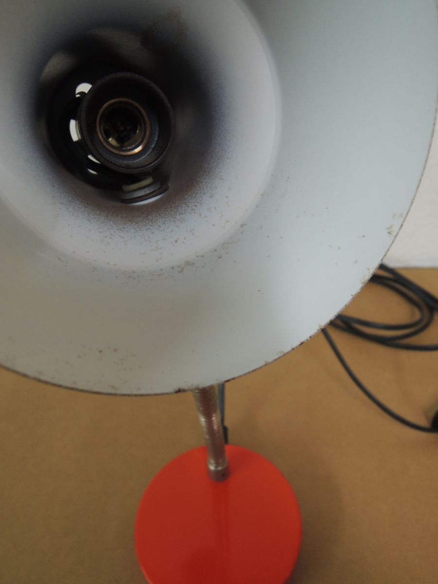 Petite lampe de bureau ou de chevet fin des années 70-début des années 80, articulée par flexible acier, douille e14, câble et interrupteur d'origine en bon état (électricité contrôlée). Feutrine de protection sous le socle. Bon état général, avec traces d'usures normales: quelques piqûres sur la peinture blanche à l'intérieur du pavillon et 2 petits éclats sur peinture orange.