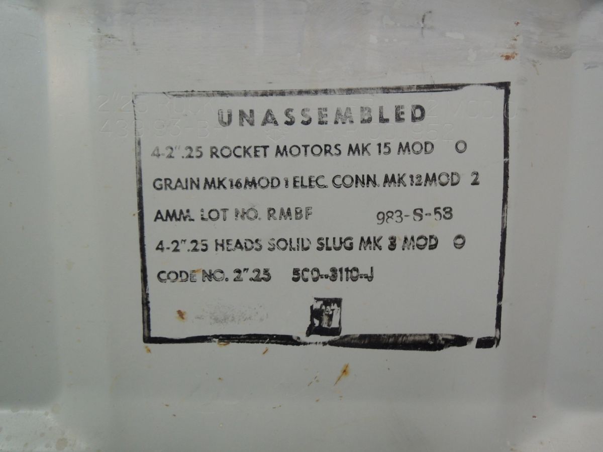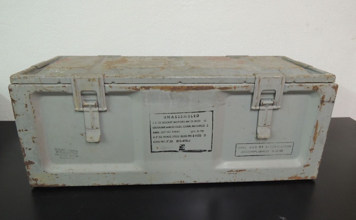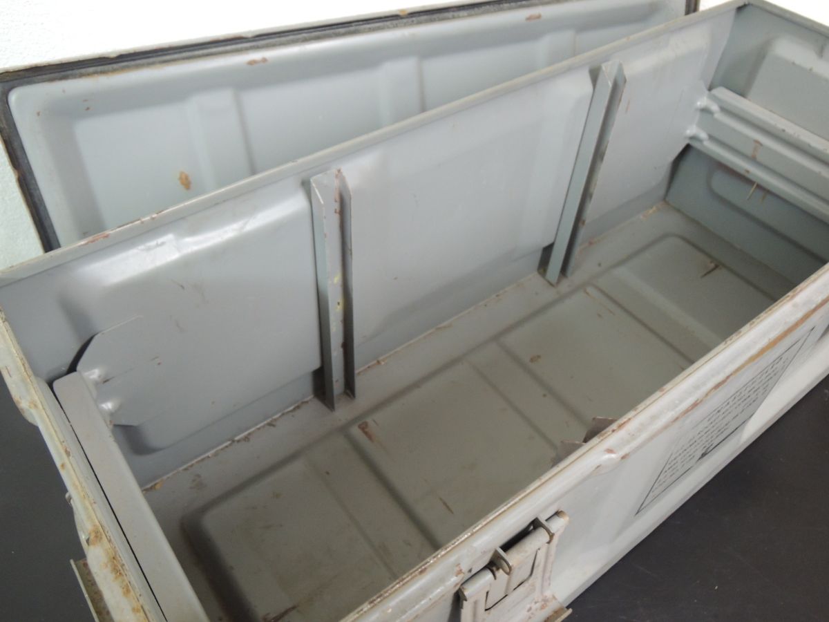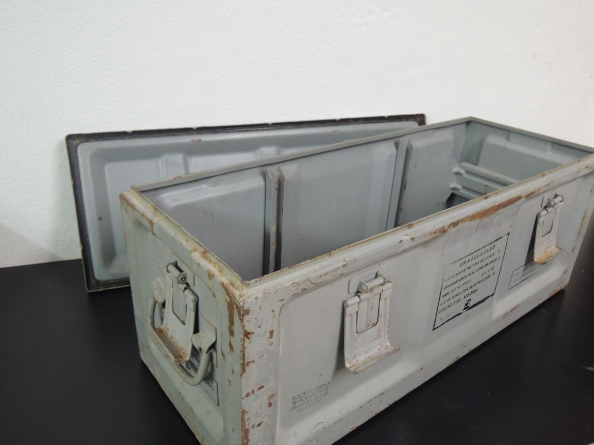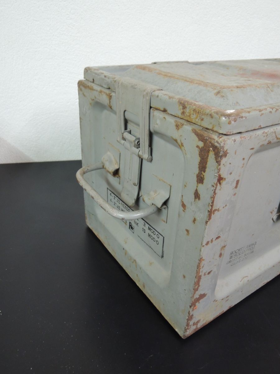 Caisse de munitions anglo-saxonne, année 1952, probablement de la marine. Fermeture du couvercle (avec joint caoutchouc d’étanchéité) par 8 loquets ; poignées rabattables. Poids à vide de 15 kg