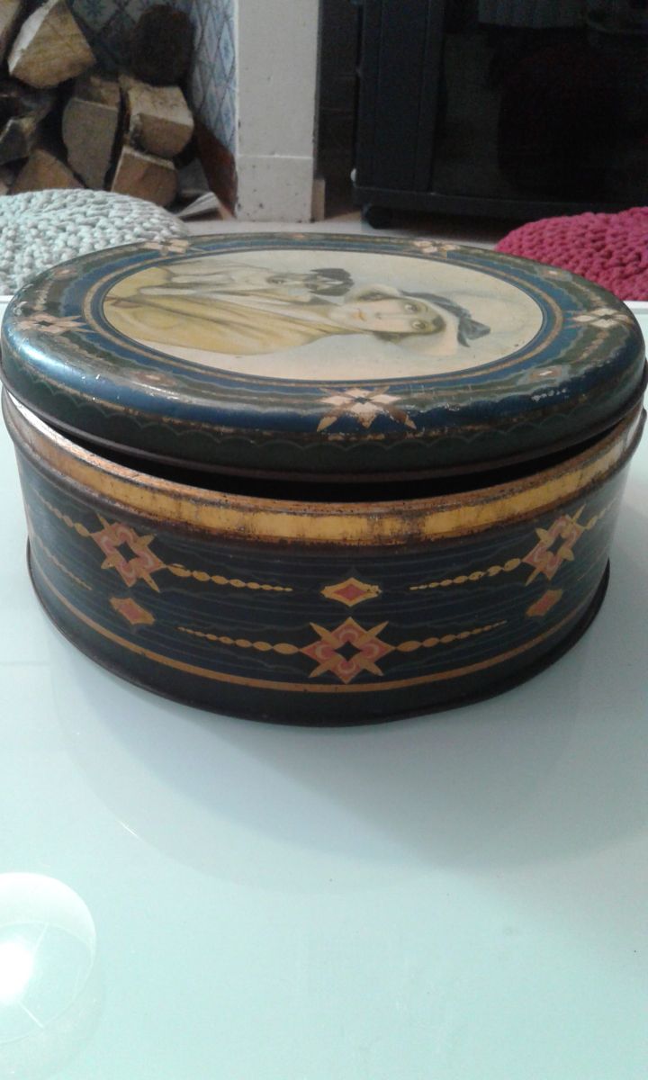Boîte metal Art Déco avec belle illustration ' elle mesure 85 cm de diamètre elle a une jolie patine.