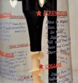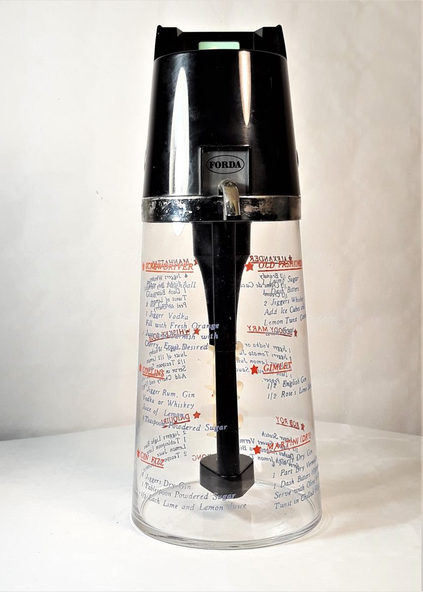 1960 - Mélangeur, Shaker à cocktail Drinko ' Matic mécanique et son verre sérigraphié de recettes de cocktails Fonctionne avec 2 piles Bonne conditions vu son âge. la pompe ne fonctionne plus Acier(inoxydable) et verre sérigraphié Dimensions: 27×10×10 cm
