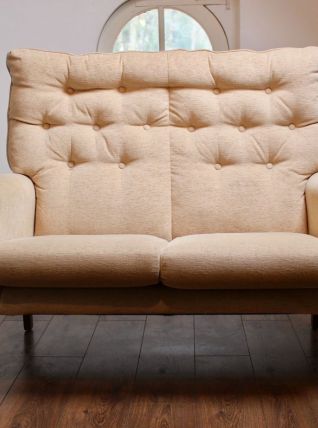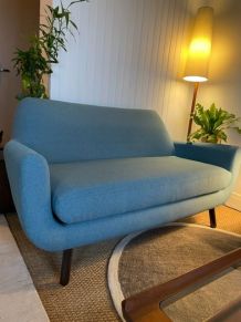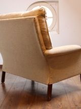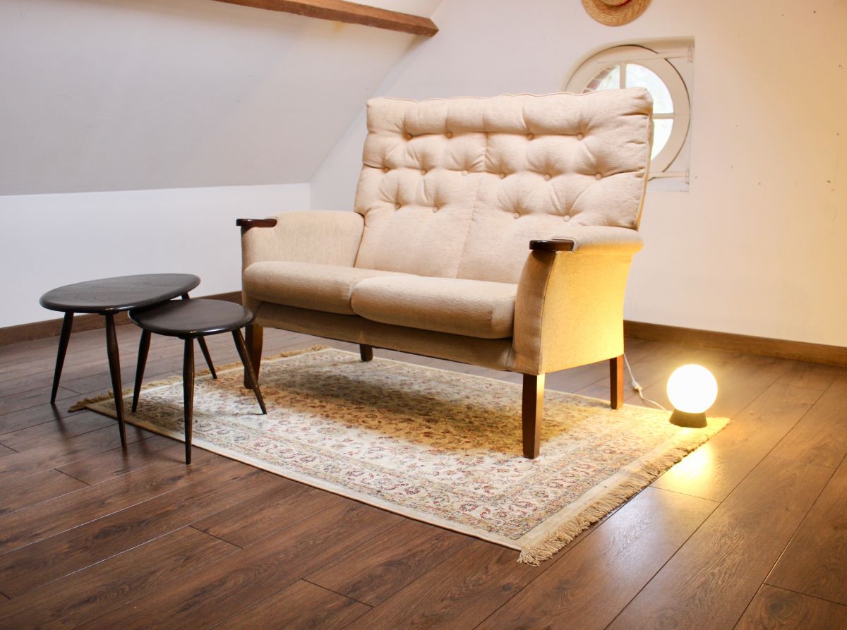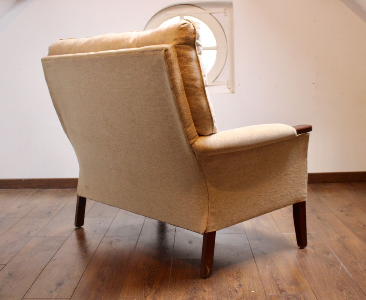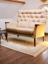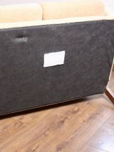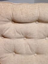 Entièrement restauré dans un tissu en velours chenille beige, ossature en bois foncé, tissu déhoussable sur l'assise.