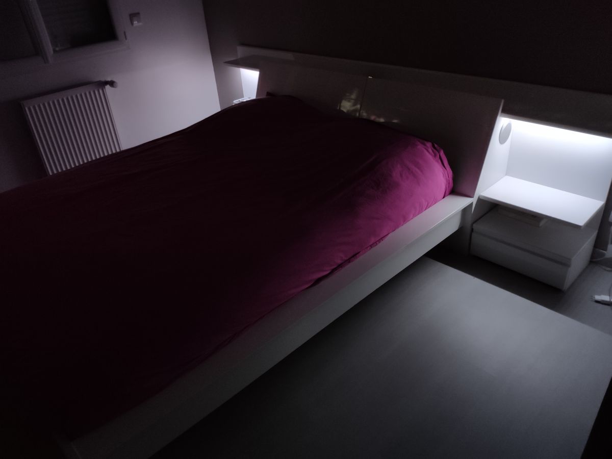 d'un éclairage leds de chaque côté du lit avec un interrupteur commun. Les deux bandes led sont collées dans une rainure sous la tablette créant une lumière diffuse autour de la tête de lit