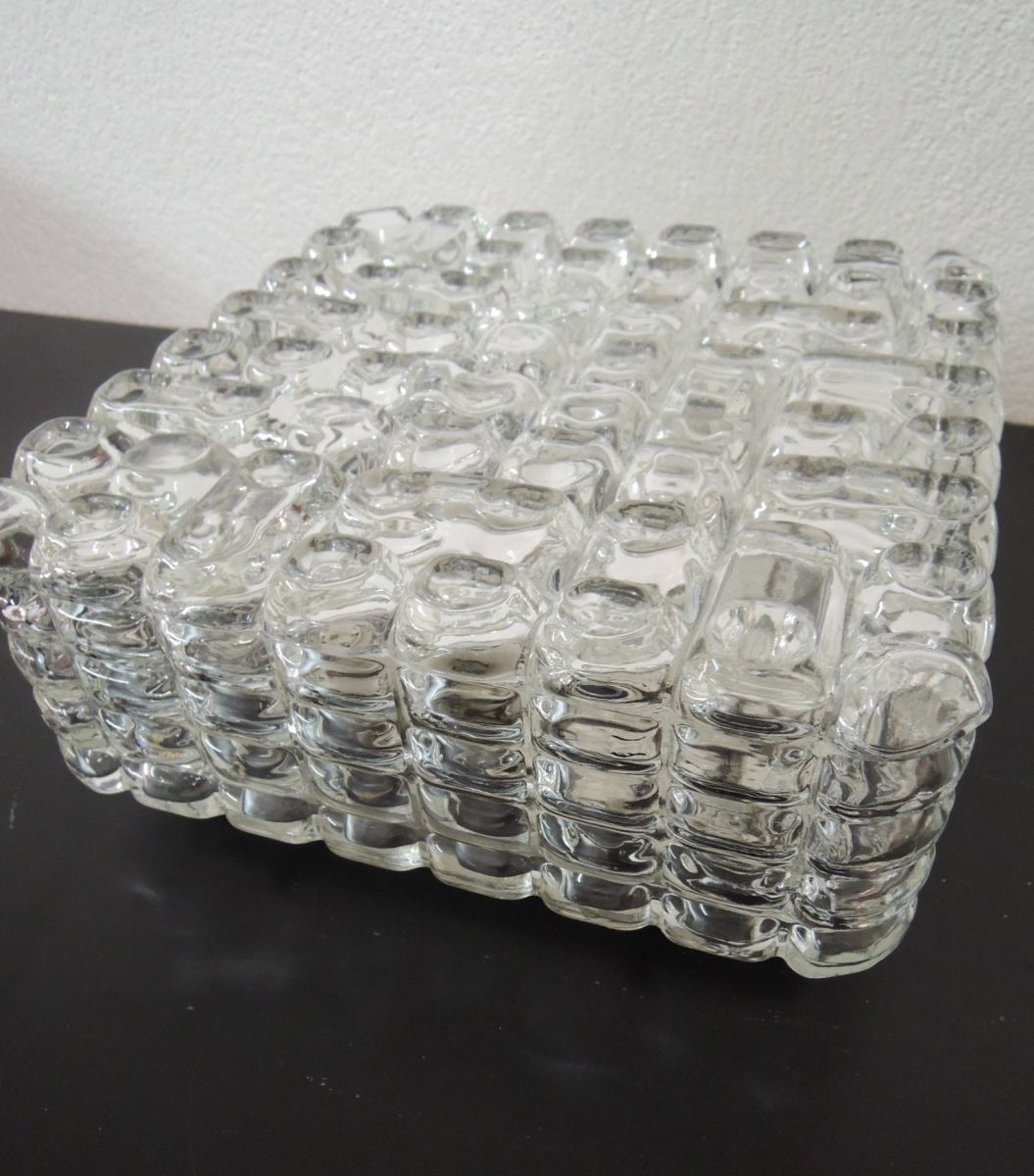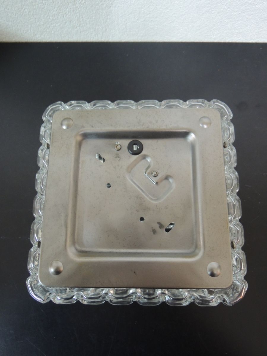 Plafonnier des années 60 en verre, de marque Erco, équipé d'une douille céramique à vis E27. Le verre au socle est maintenu par 4 vis. Seule la partie extérieure du socle a été restauré (suppression de la rouille et vernis incolore), revêtement intérieur du socle altéré par le temps sans que cela soit visible une fois installé. Peut s'installer en plafonnier ou en applique. Poids 3.25 kg