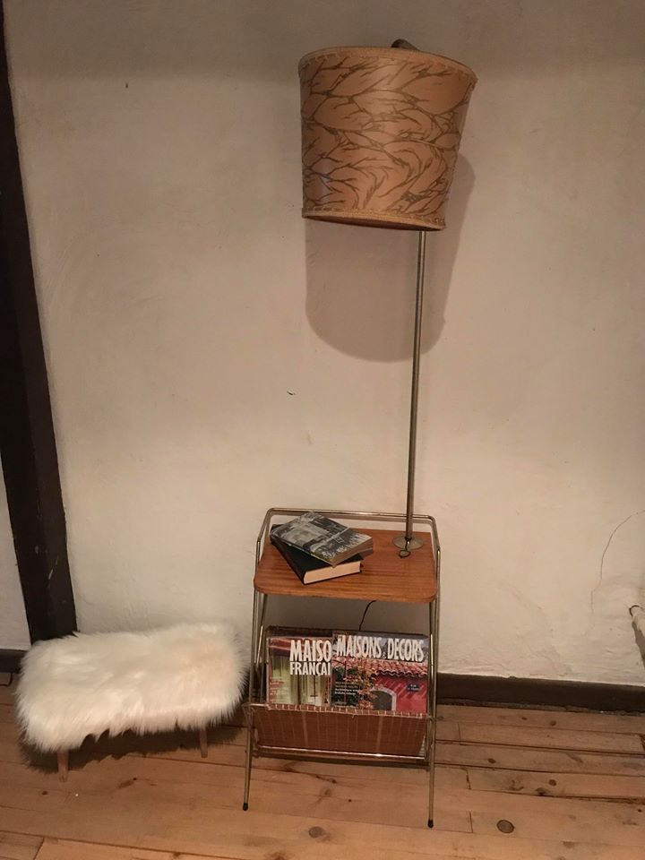 Ce magnifique lampadaire vintage année 1950 a une délicate courbe ,, design, élégant...Et tellement vintage. On ne verra que lui dans votre salon, complice de votre lecture en vous éclairant et en conservant vos revues. Sur sa jolie tablette vous aurez plaisir à exposer un objet qui profitera de sa belle lumière. Son abat-jour est d'époque avec des marbrure doré d'époque. La structure métallique est dorée à l'or fin , Ce Lampadaire possède aussi un porte-revues et une tablette de 40 x 30. Hauteur :157cm - largeur: 42cm -Profondeur 40cm. Hauteur de la tablette : 51,50cm.