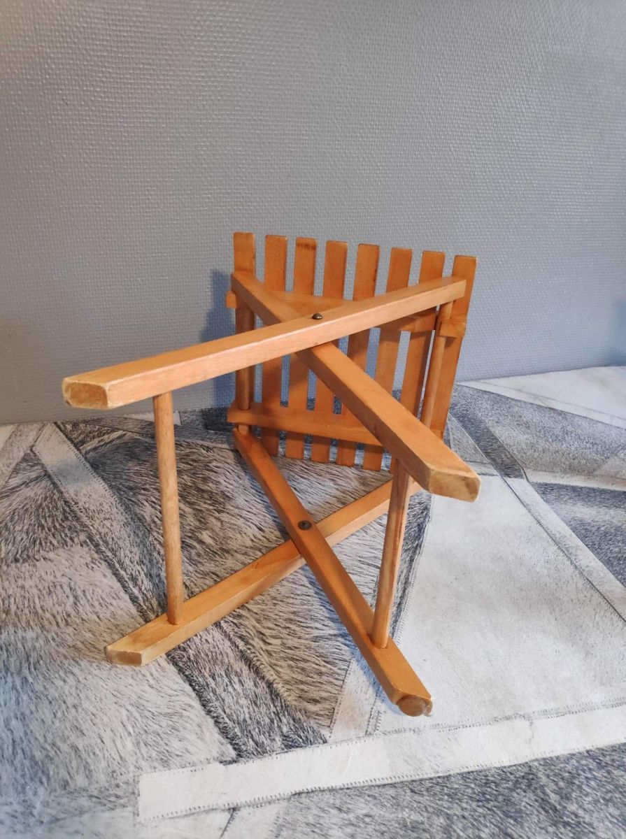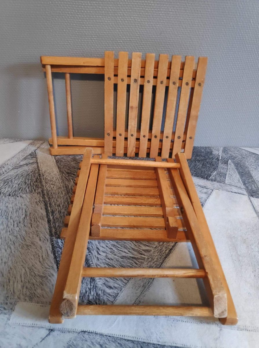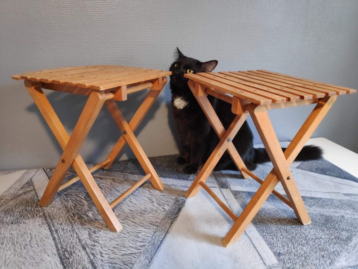 petits tabourets de pêche vintage pliants en bois vernis.