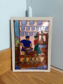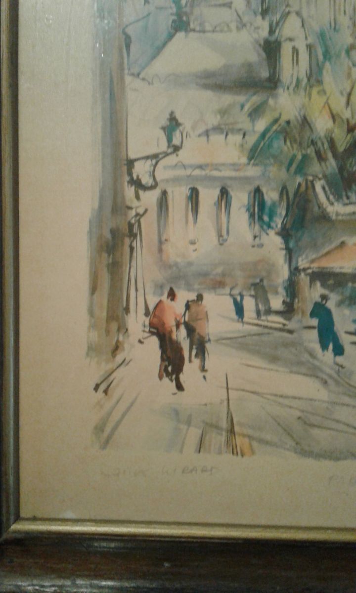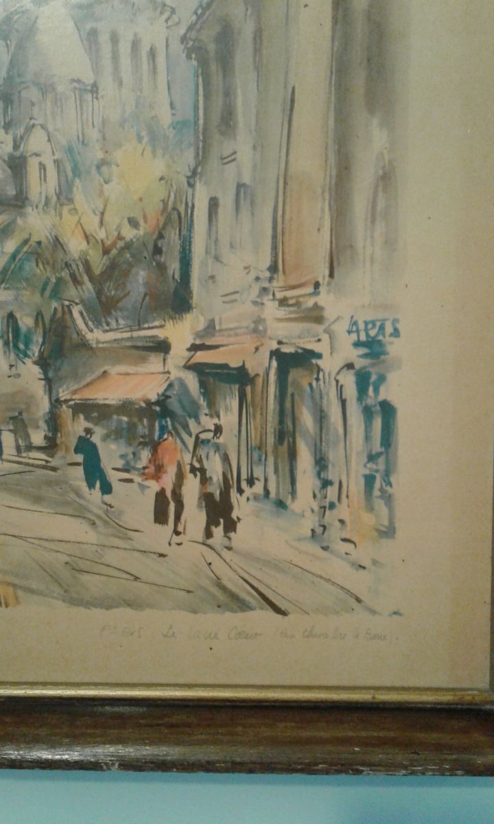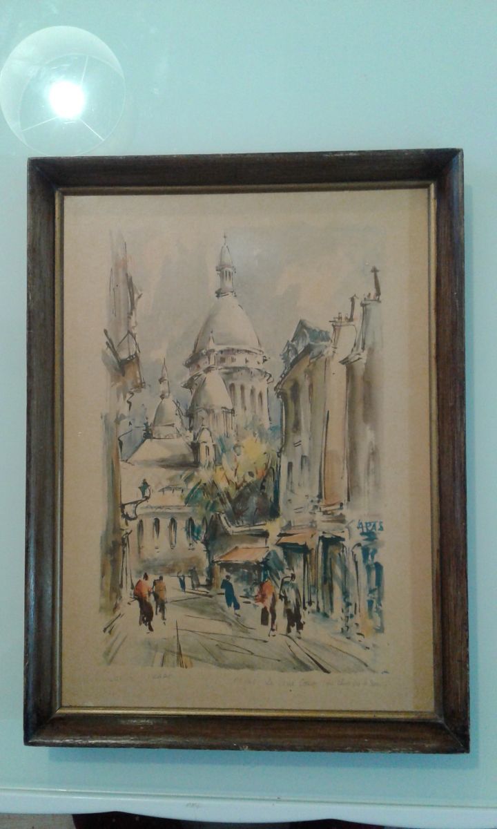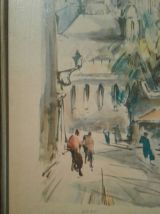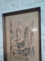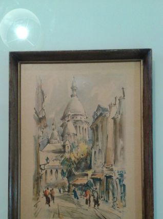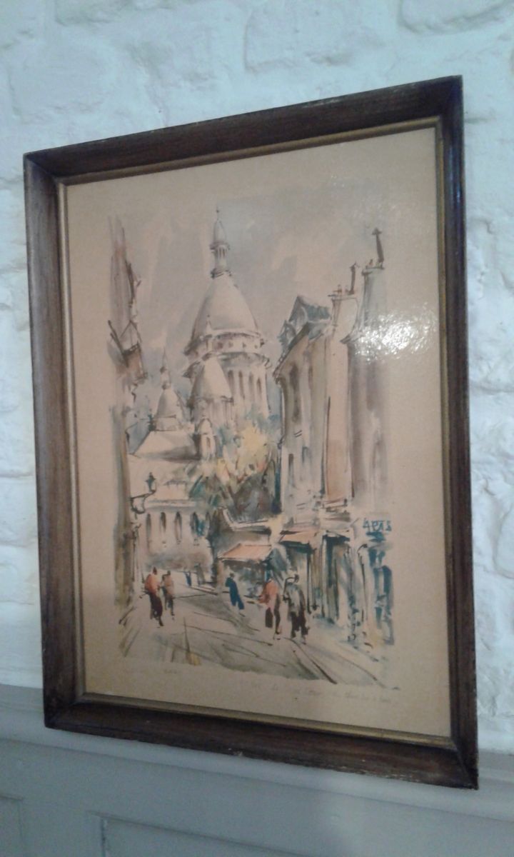 Reproduction sur cadre bois de l artiste Marius Girard Paris le Sacré Coeur rue du chevalier la barre année 60.