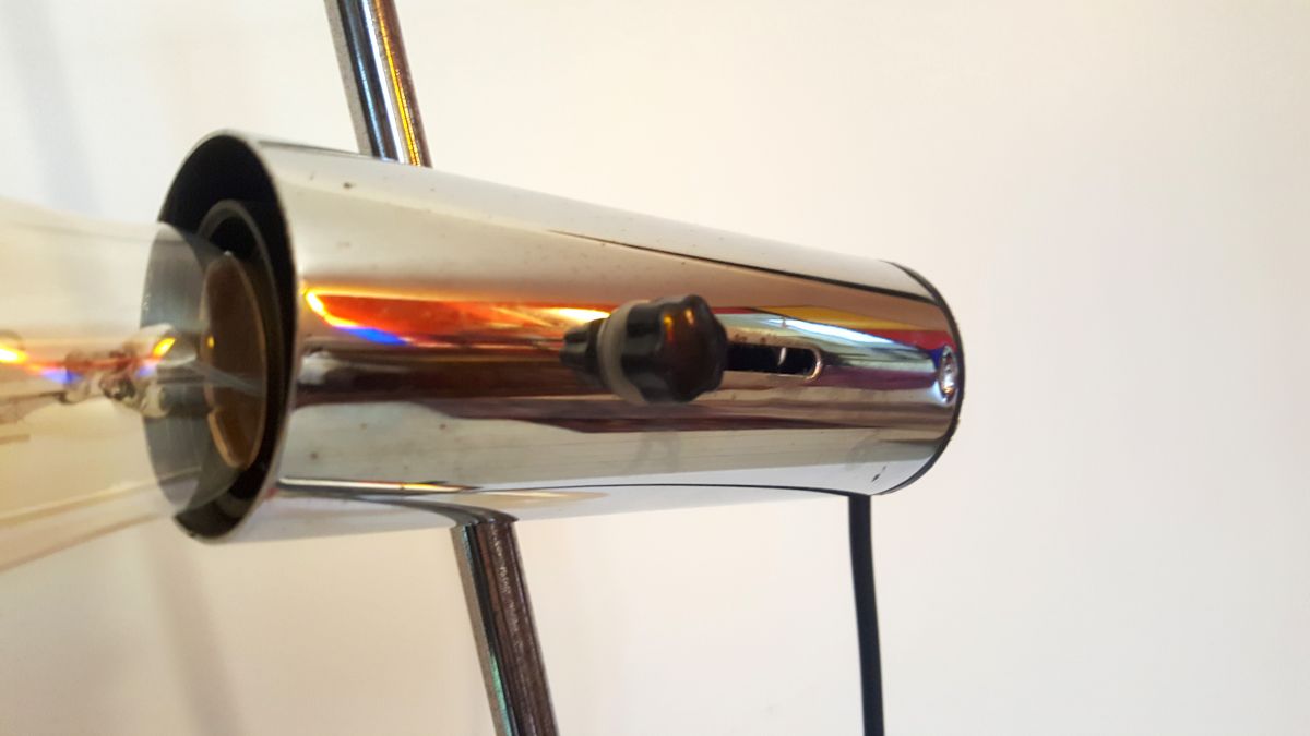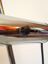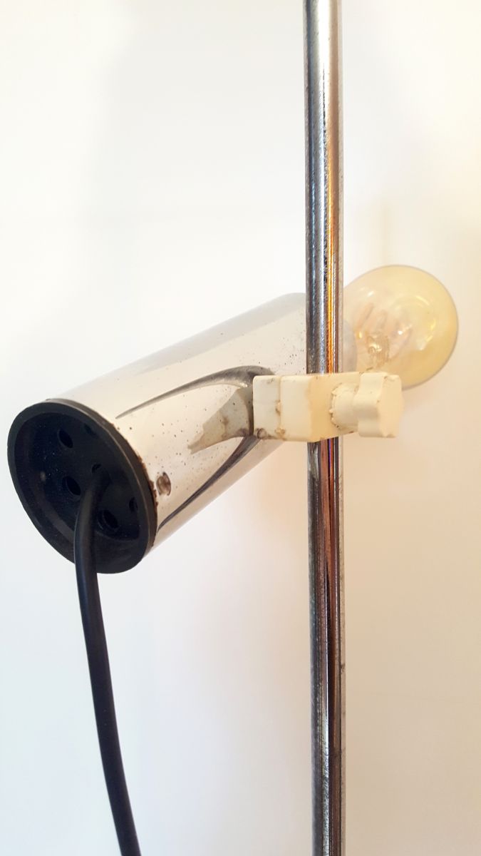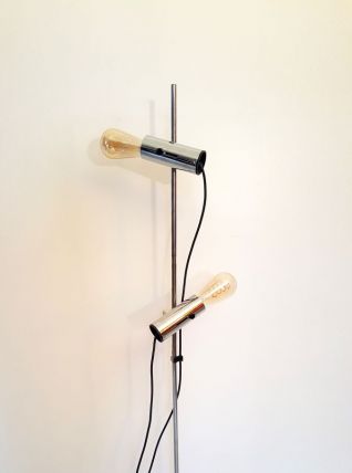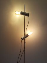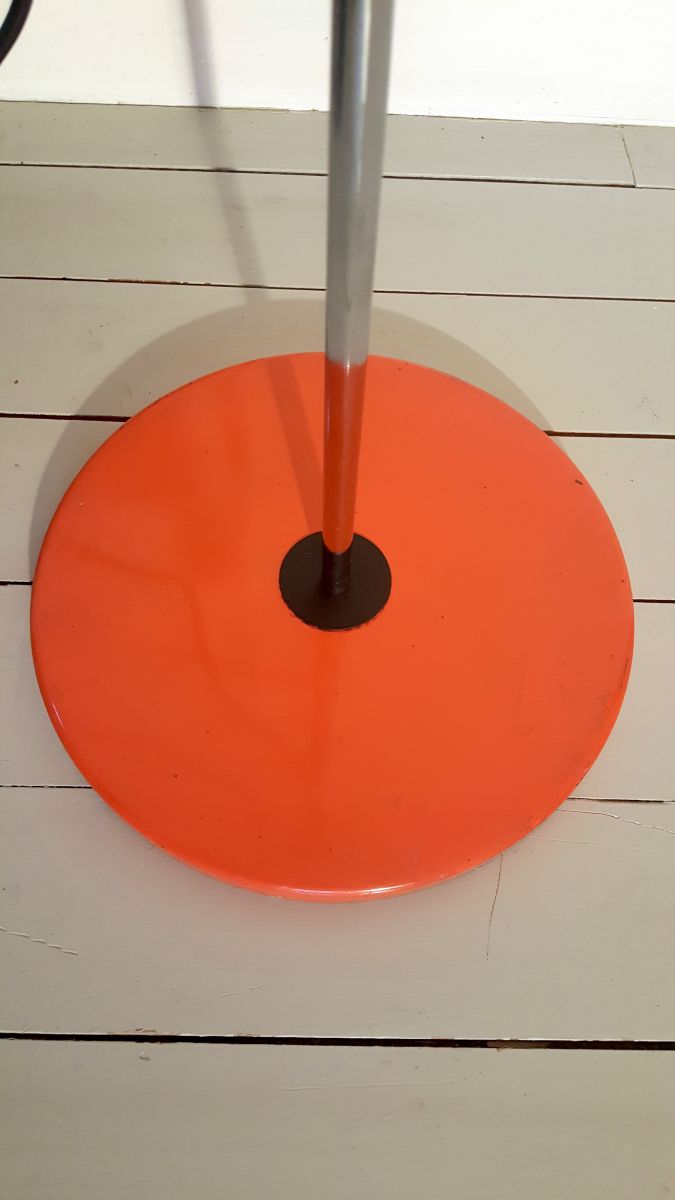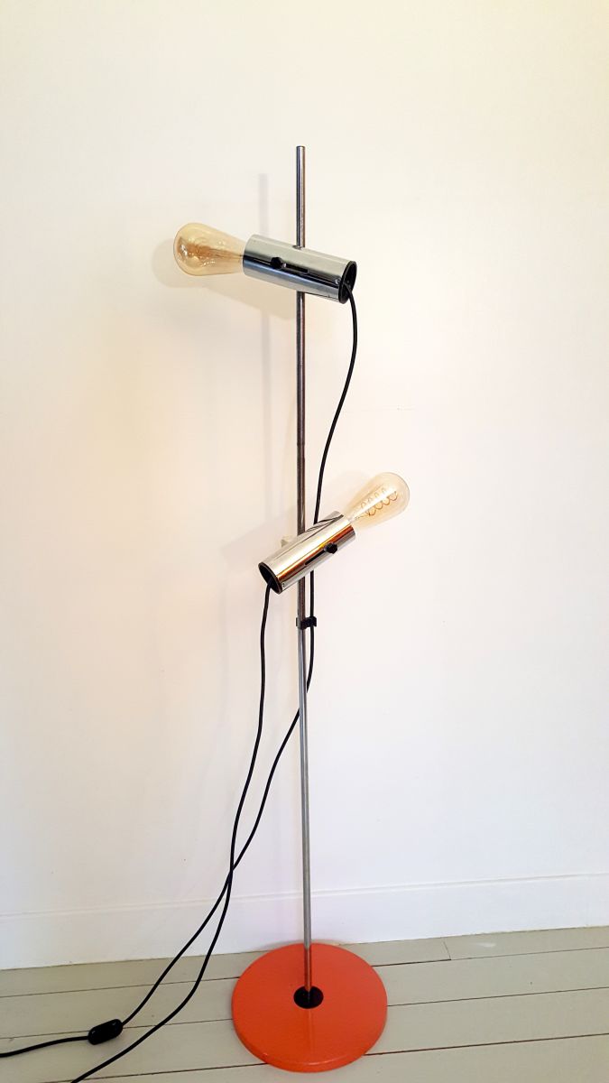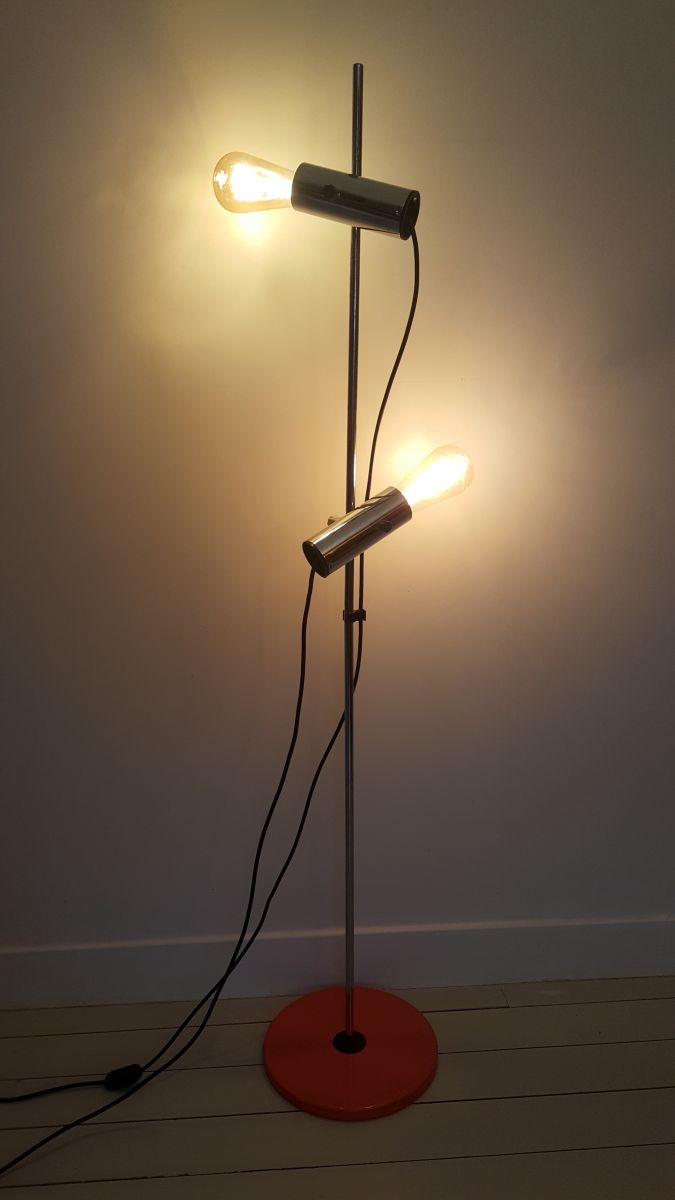 Lampadaire année 70 à deux spots dans le gout de alain richard pour disderot. Base orange qui lui confère tout son style vintage en métal, tige en acier et spots chromés. Spots ajustables en hauteur et orientables pour optimiser l’éclairage. Bon état, quelques marques du temps sont présentes et visibles sur les photos, 2 cables d'alimentation électrique; culot e27