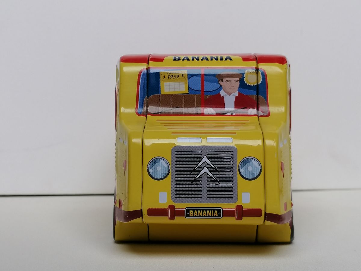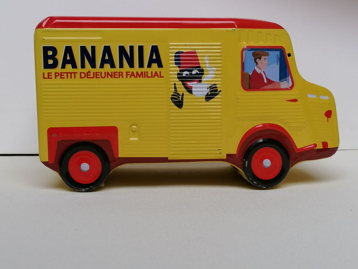 Camion Citroën publicitaire pour la marque Banania. Une fente sur le toit sert à déposer les pièce, tirelire. La boîte s'ouvre sur le côté. Je peux changer les photos afin de vous permettre de mieux voir le produit. "Modèle déposé" Produit sous licence Citroën. En bon état général et conforme aux photos.