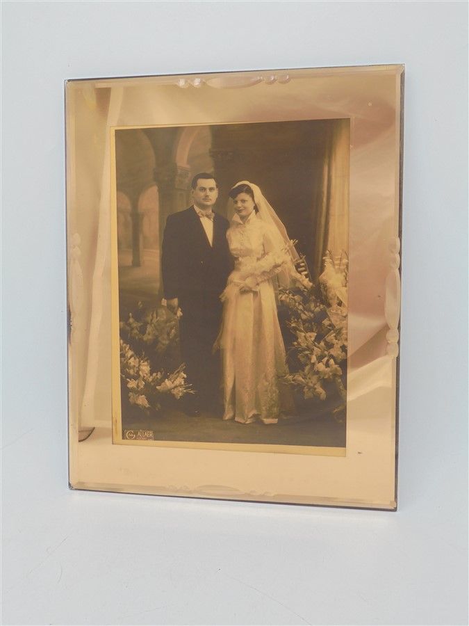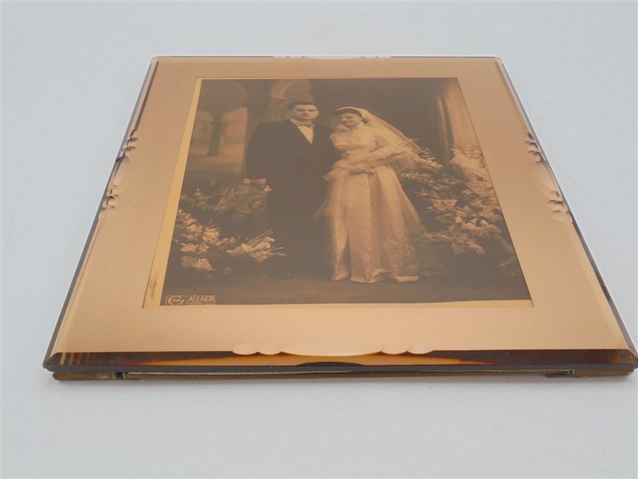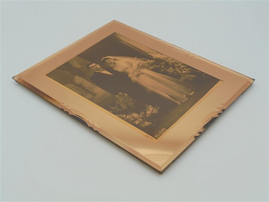 Ancienne photo de mariage, dans un cadre miroir rosé biseauté de style art déco, à suspendre. Il comporte un minuscule éclat dans l'angle inférieur gauche et quelques taches et micro-rayures dues à son ancienneté, plutôt discrètes. Dimensions : 24 x 30 x 1.5 cm Poids : 1.490 kg