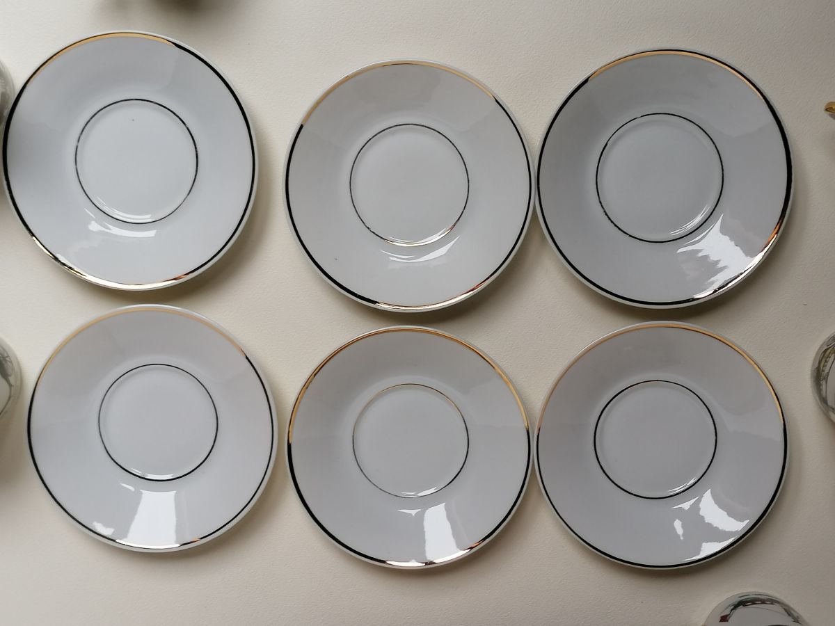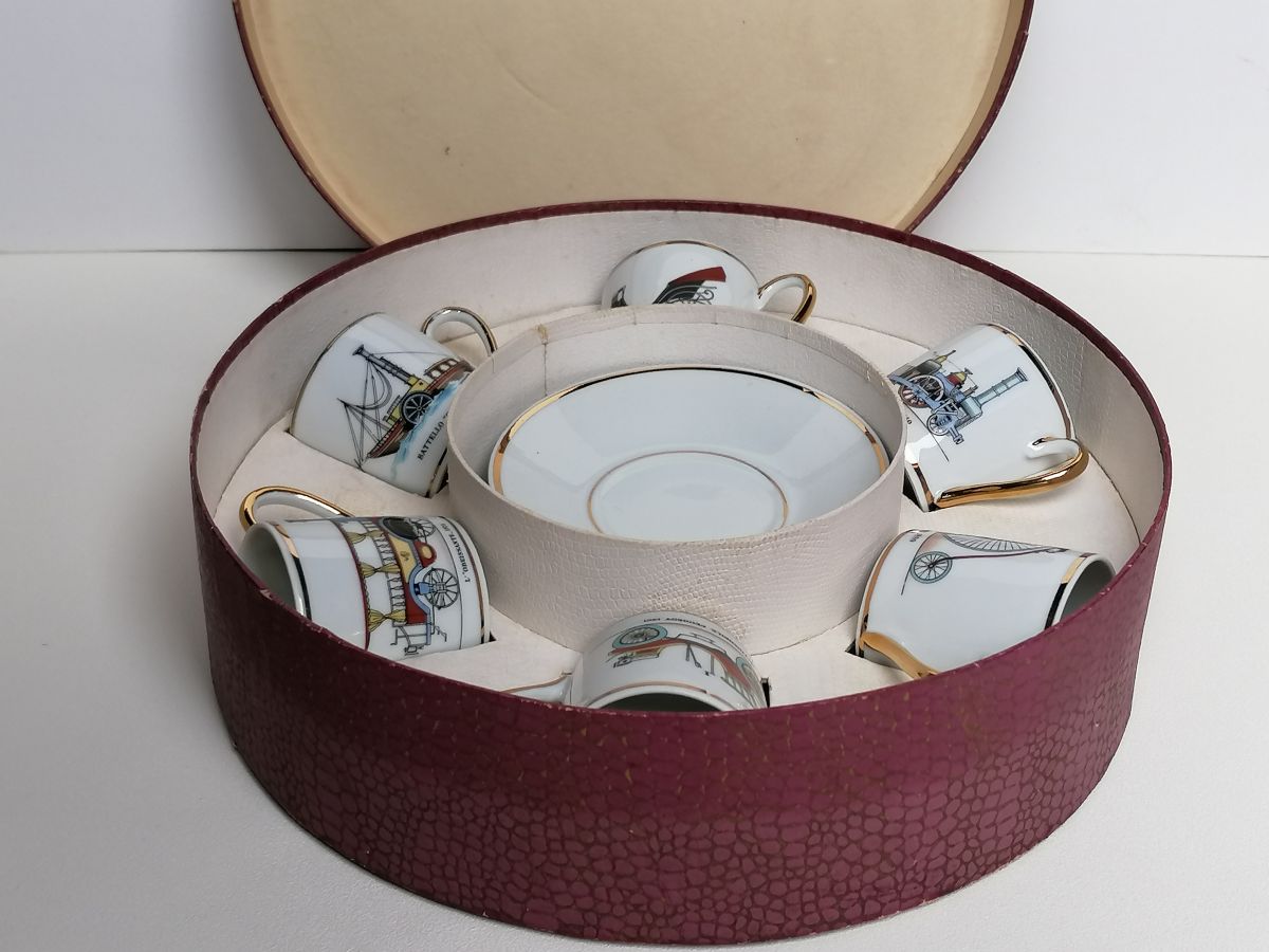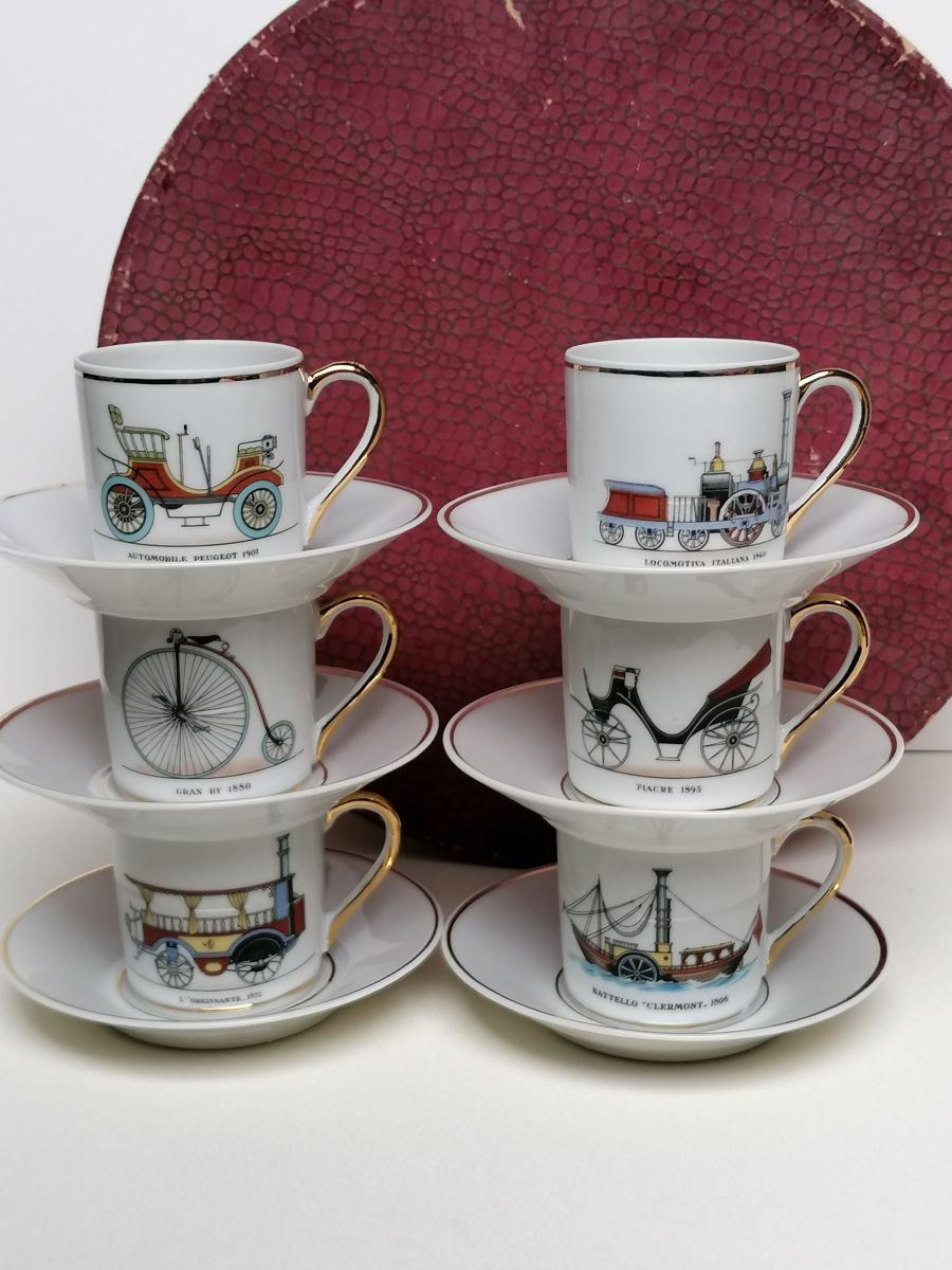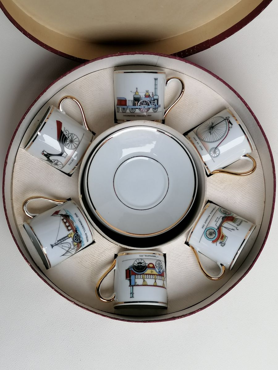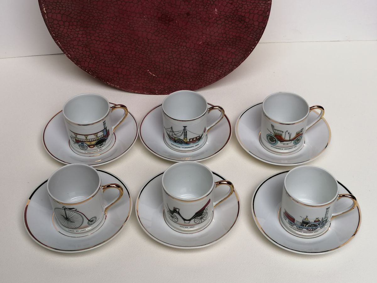 Ancien service à café, comprenant 6 tasses à moka et leurs sous-tasses, décorées des différents moyens de locomotion de la belle époque et d'un filet d'or.
