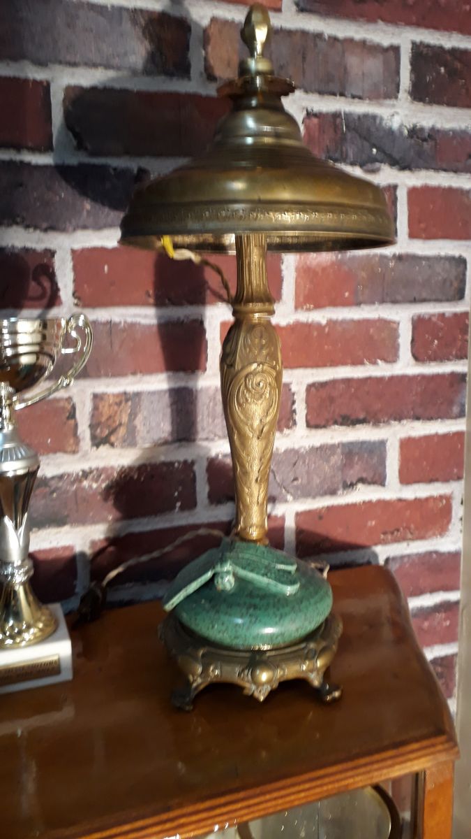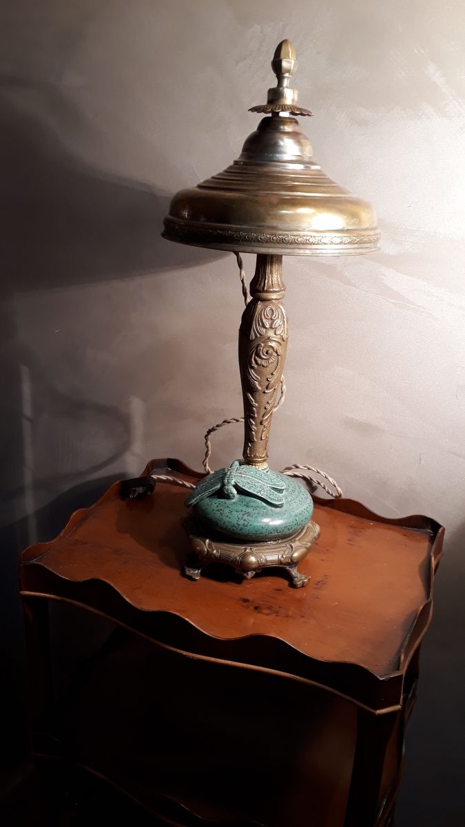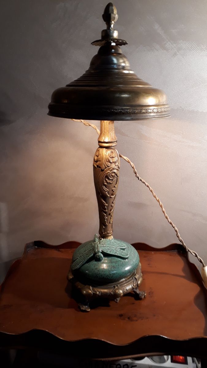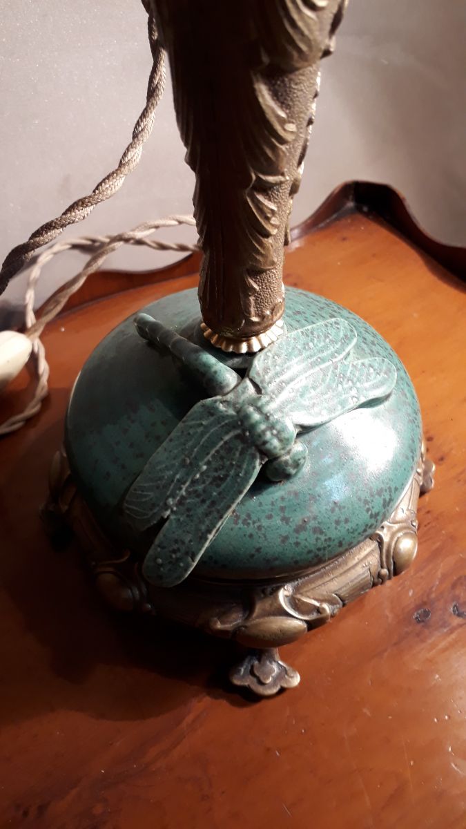 lampe art nouveau poterie signee libelulle , sur socle laiton abat jour laiton