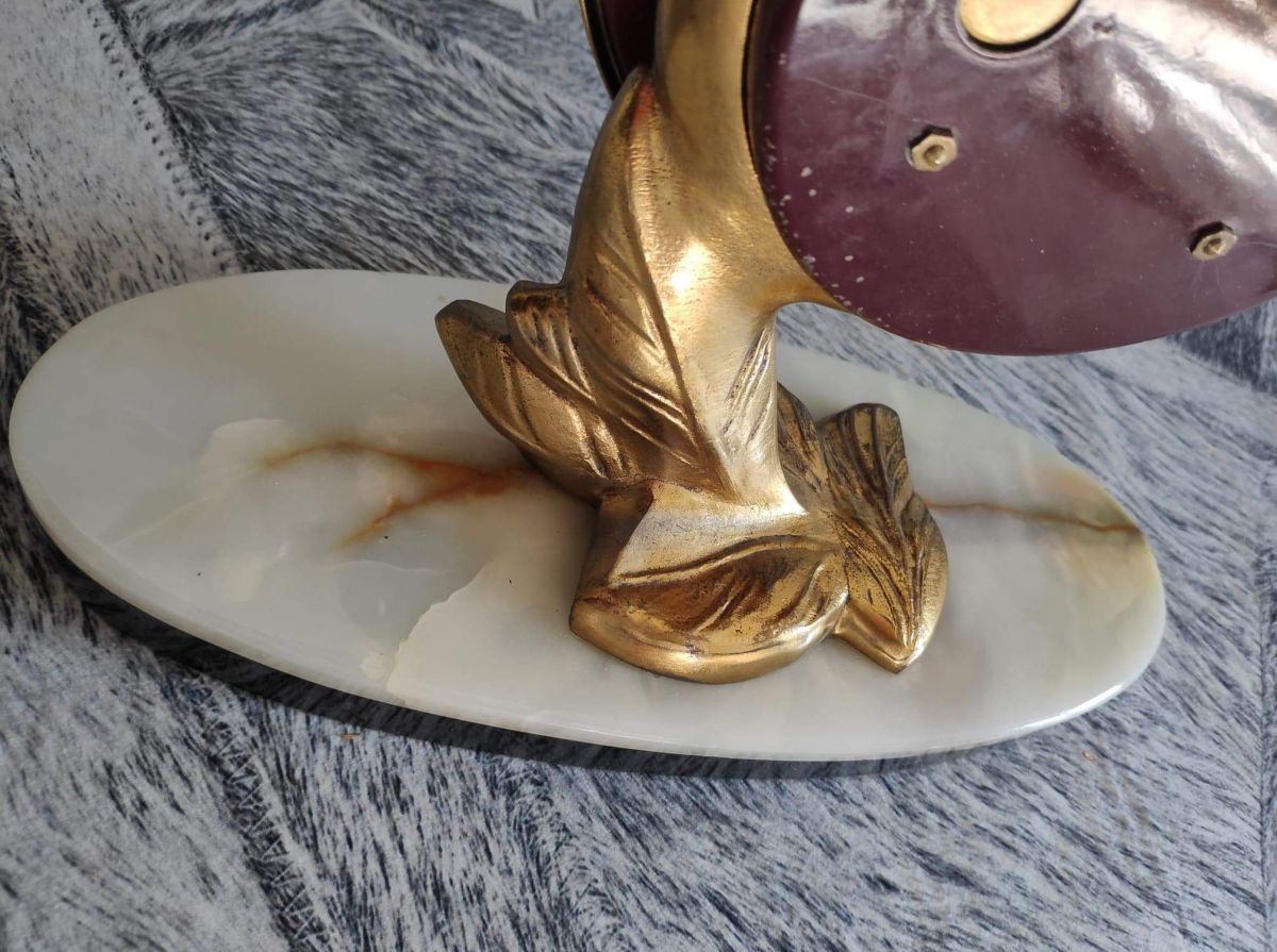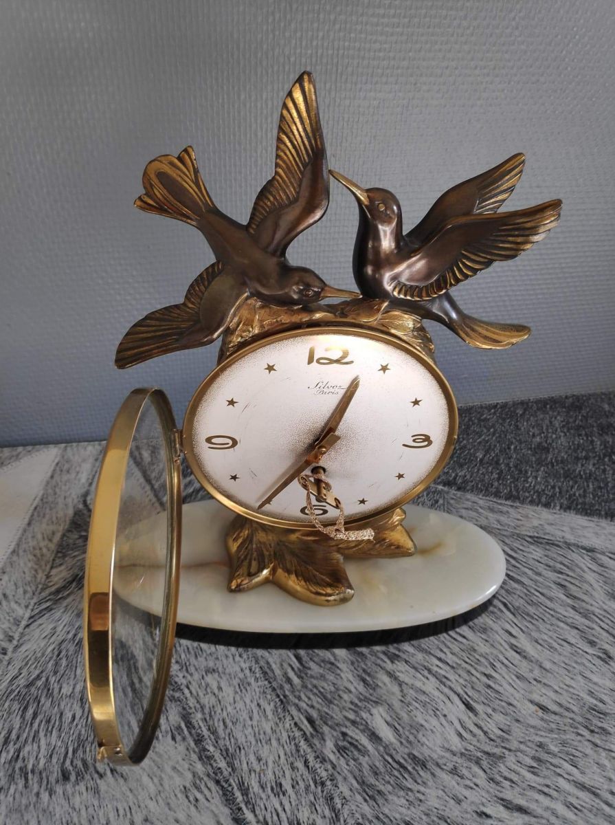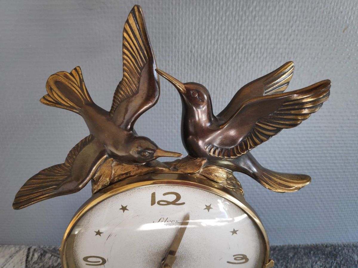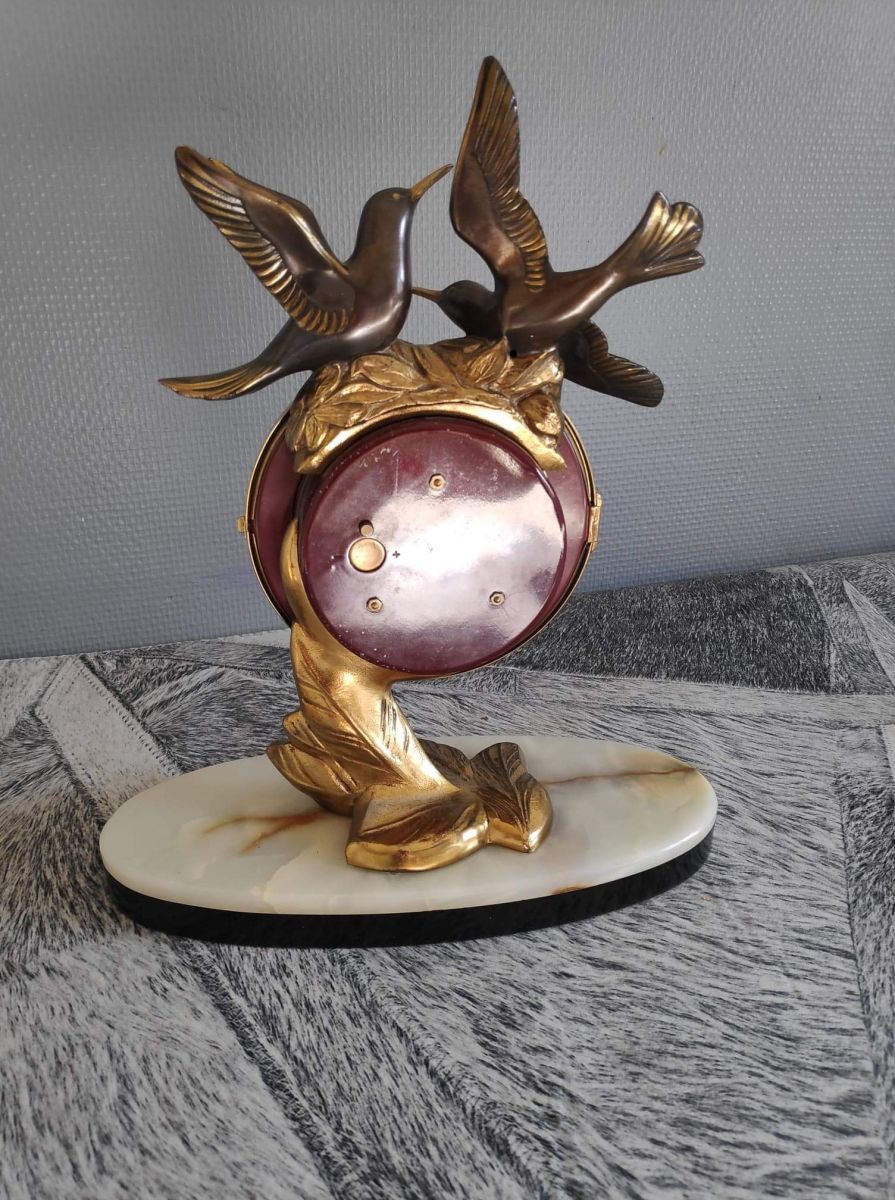 pendule de cheminée art déco Silvoz, socle en marbre veiné, oiseaux et déco en régule avec clé