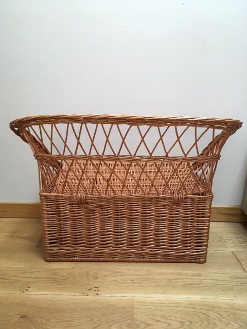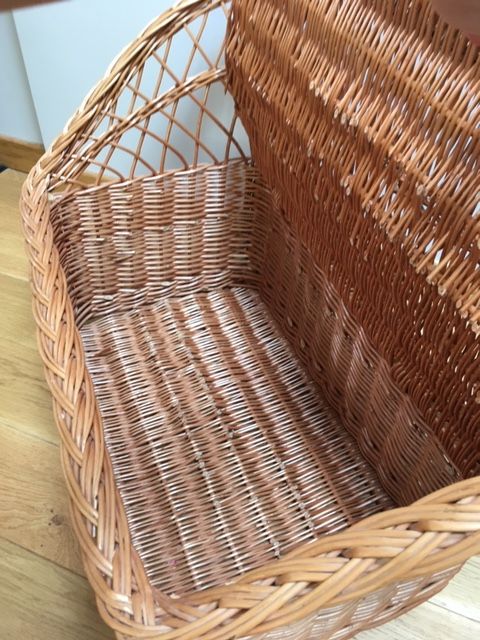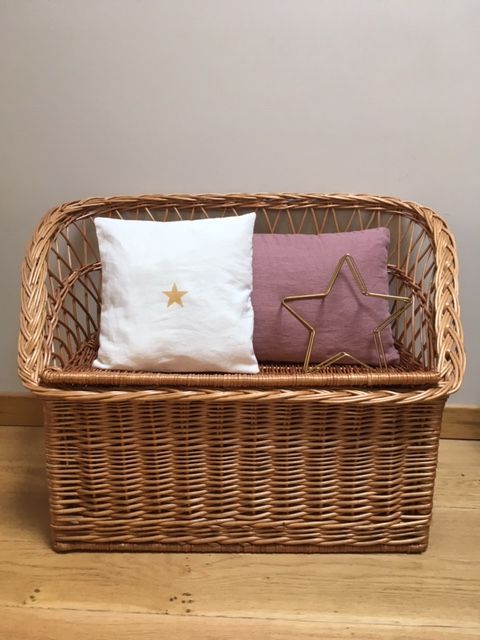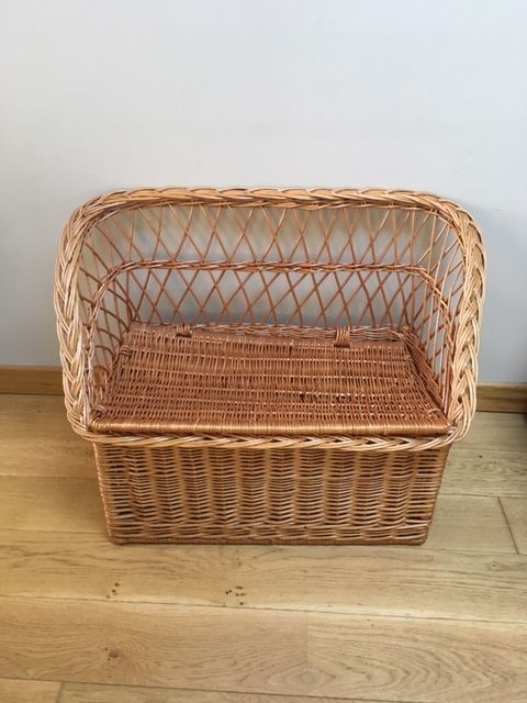 Coffre à jouet ancien, banquette ou banc, en rotin avec couvercle. Fond en osier. Bon état général.