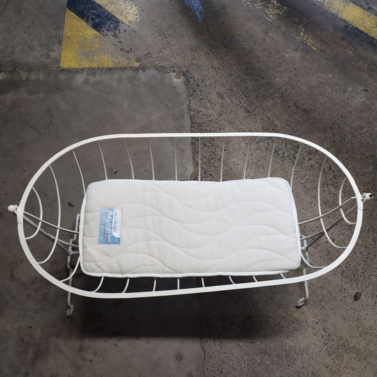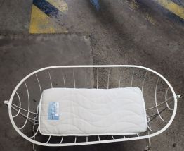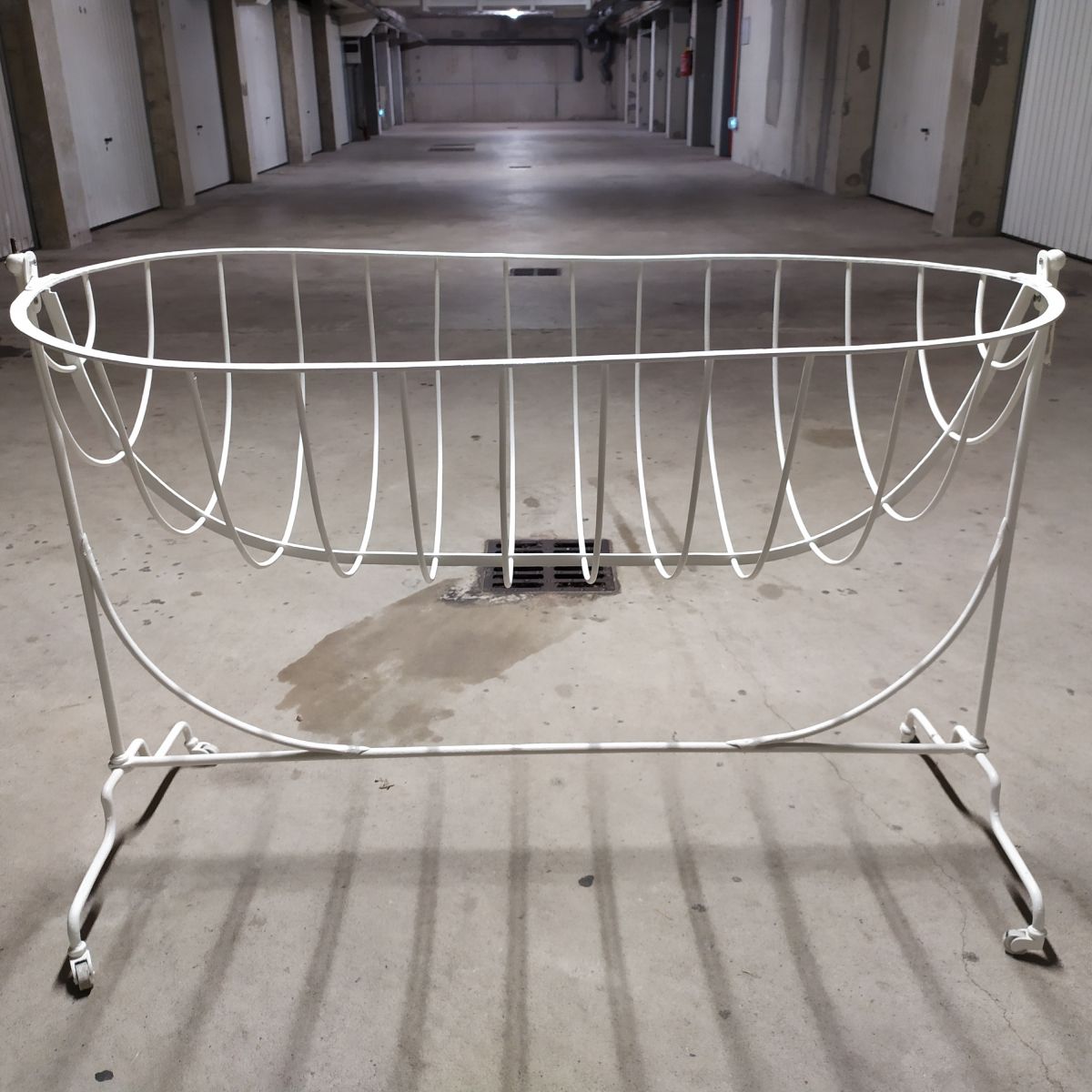 Berceau sur roulettes en fer forgé parfaitement décapé puis repeint avec peinture blanche de qualité.