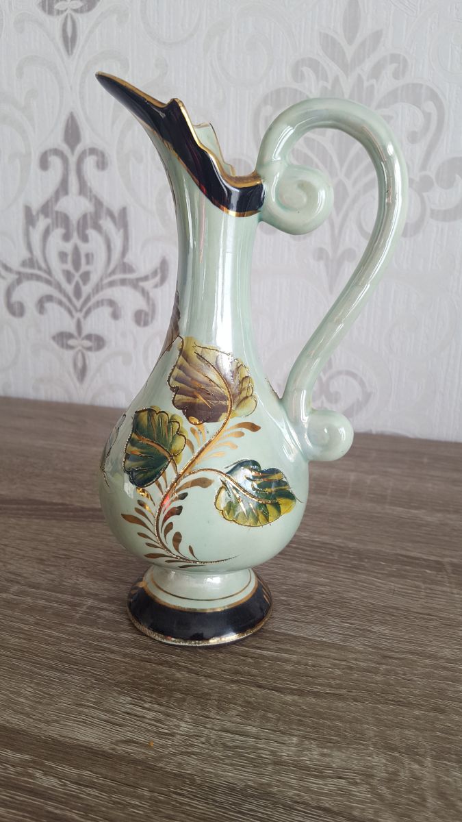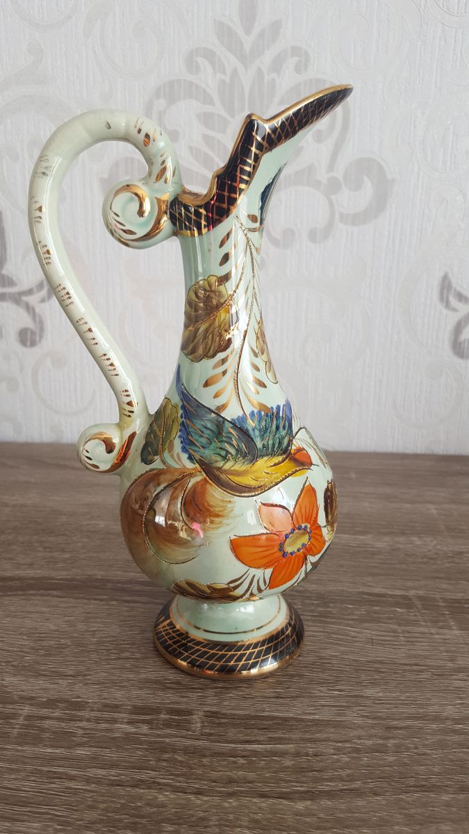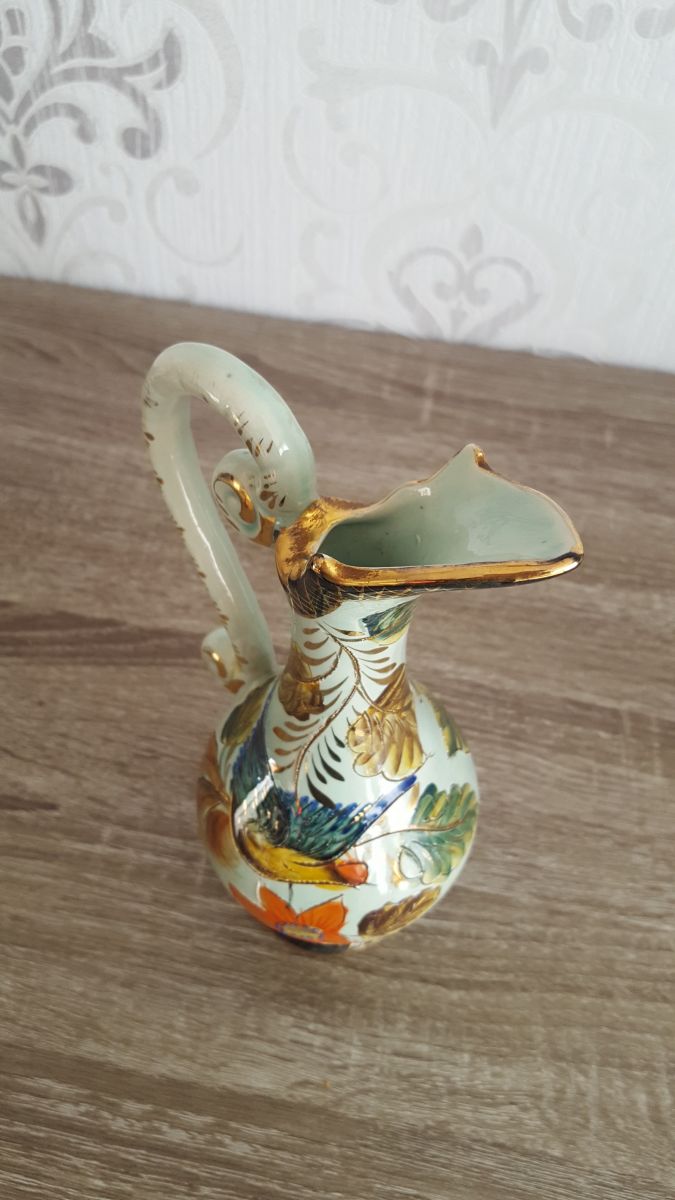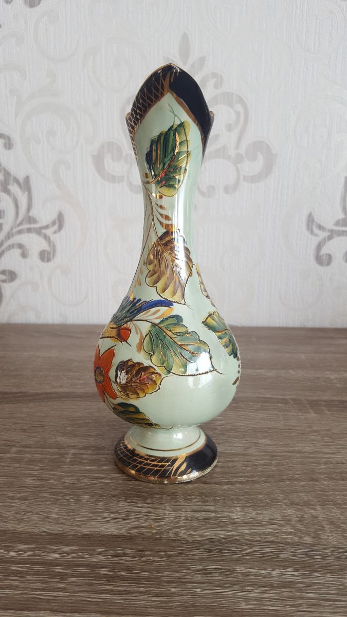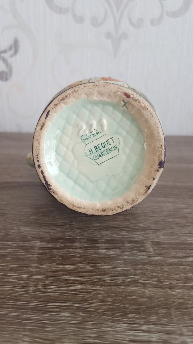 jolie petit vase en céramique, peint à la main, motif floral et oiseau sur fond vert, provenant de Quaregnon en Belgique, signée Hubert Bequet, numéroté 271.