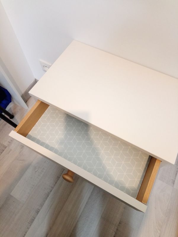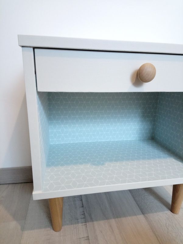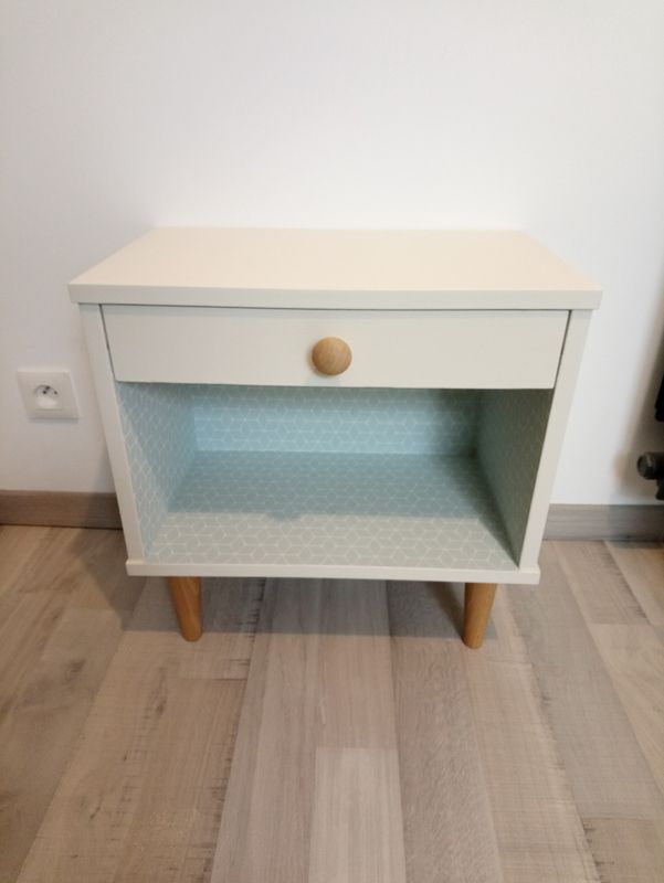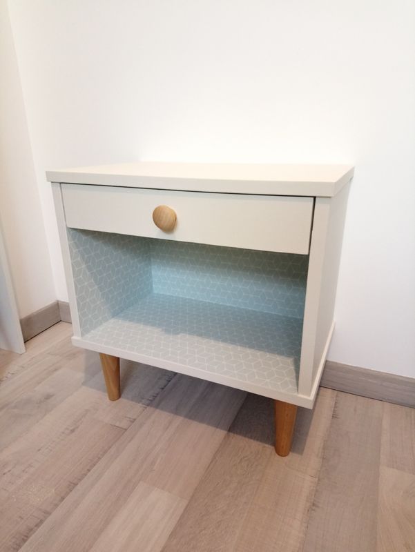 Chevet peint en blanc cassé, intérieur du tiroir et niche tapissés d'un joli papier scandinave bleu, motif géométrique blanc! Les pieds ont été changé!