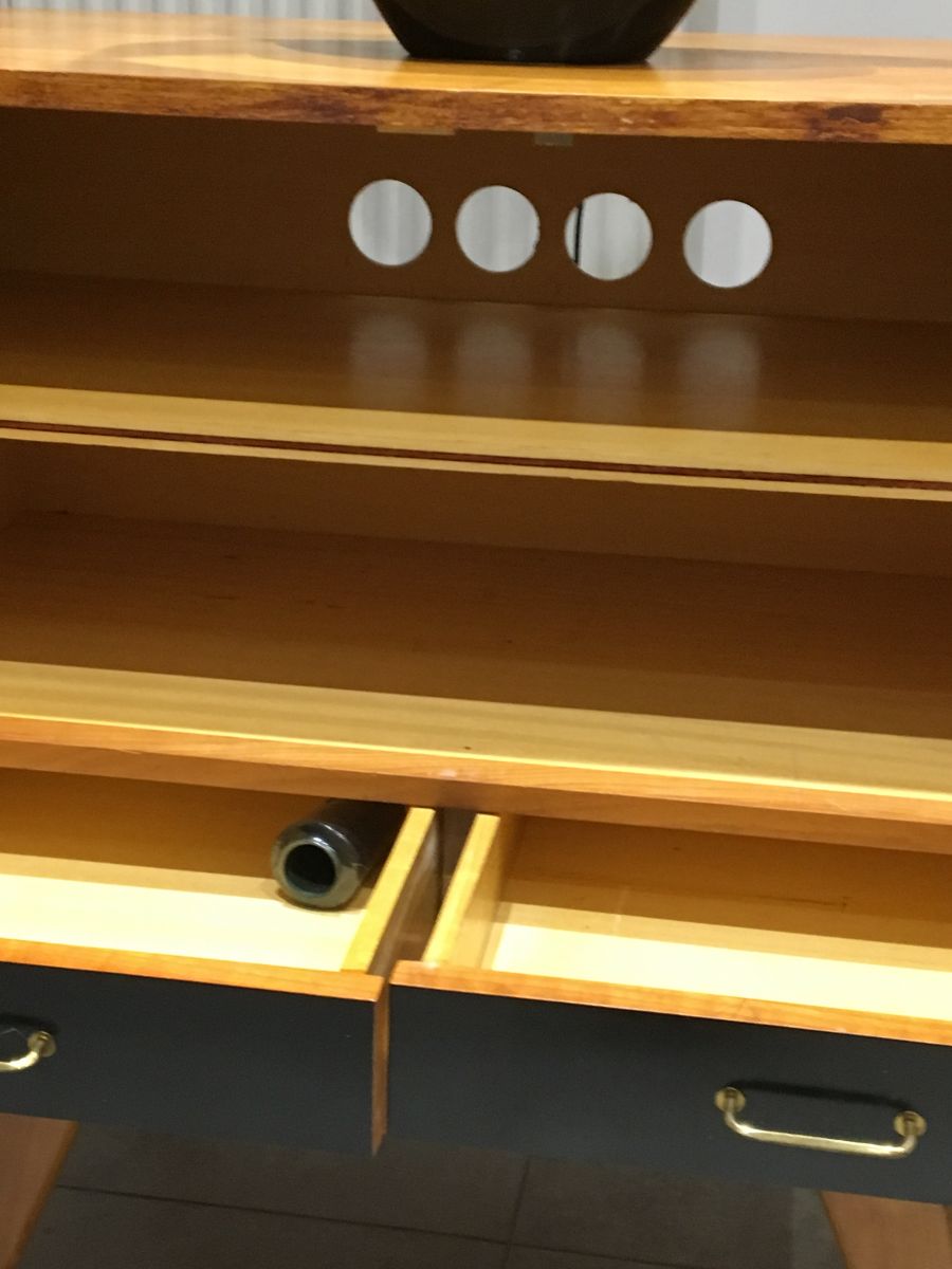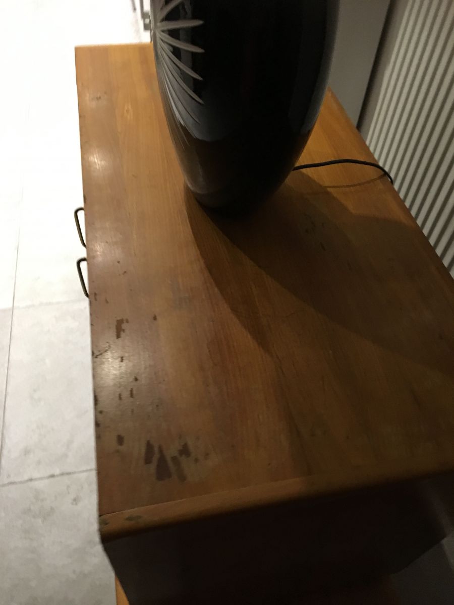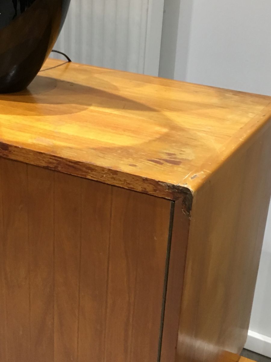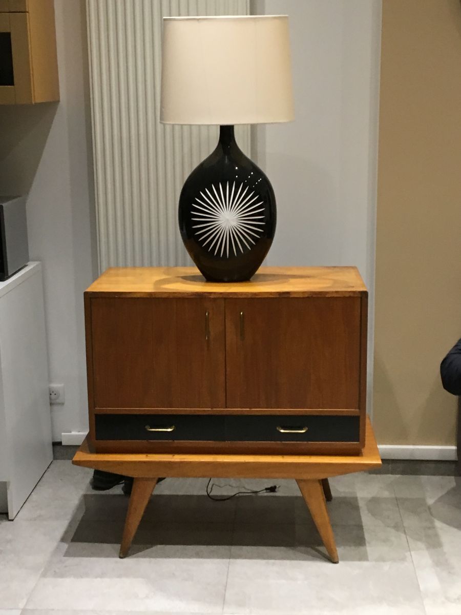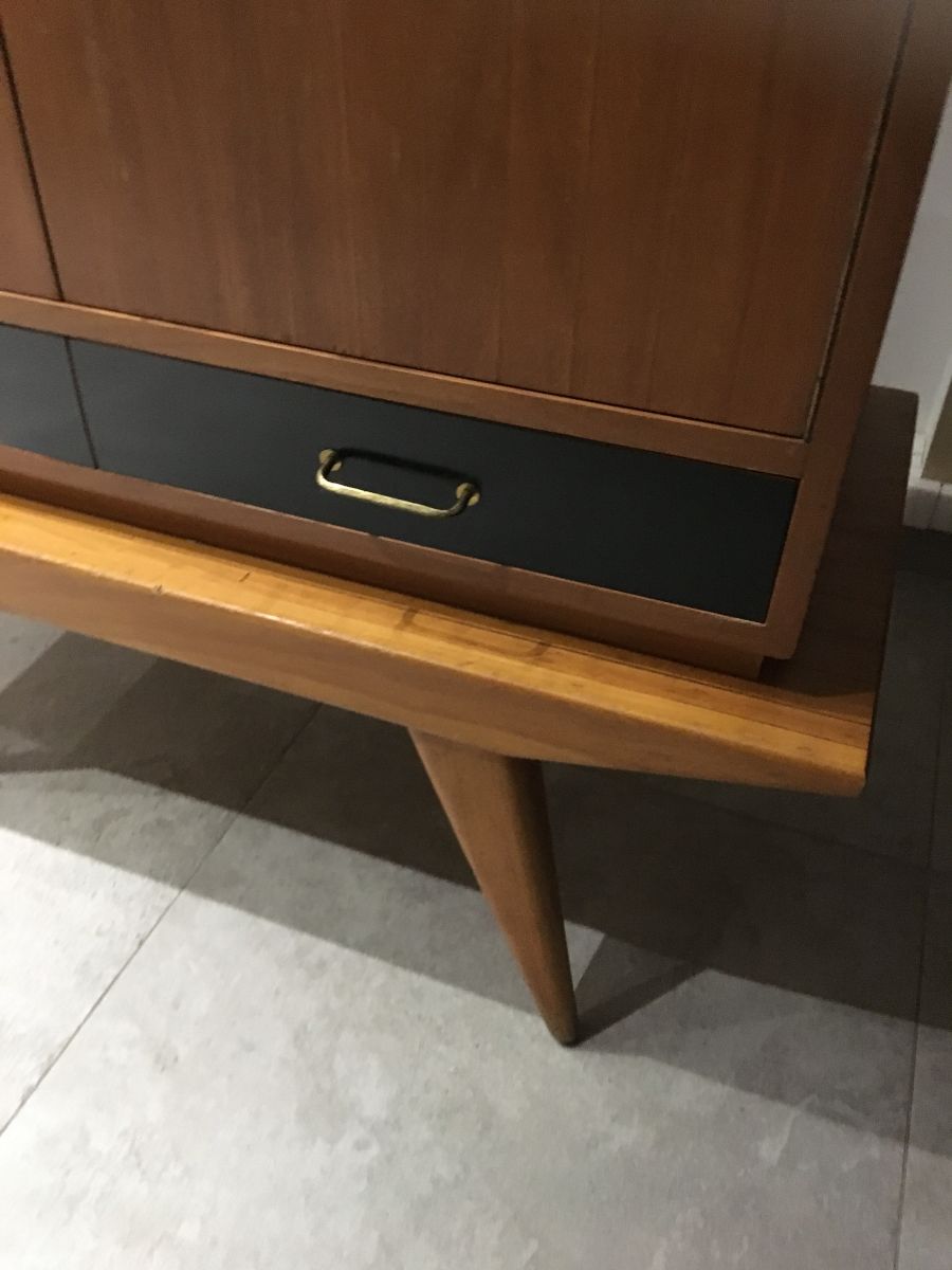 Meuble vintage, pieds compas, 90cm/90. Il est en excellent état hormis le plateau légèrement abîmé par les taches du temps et au niveau de l’arete Du haut du meuble voir photo