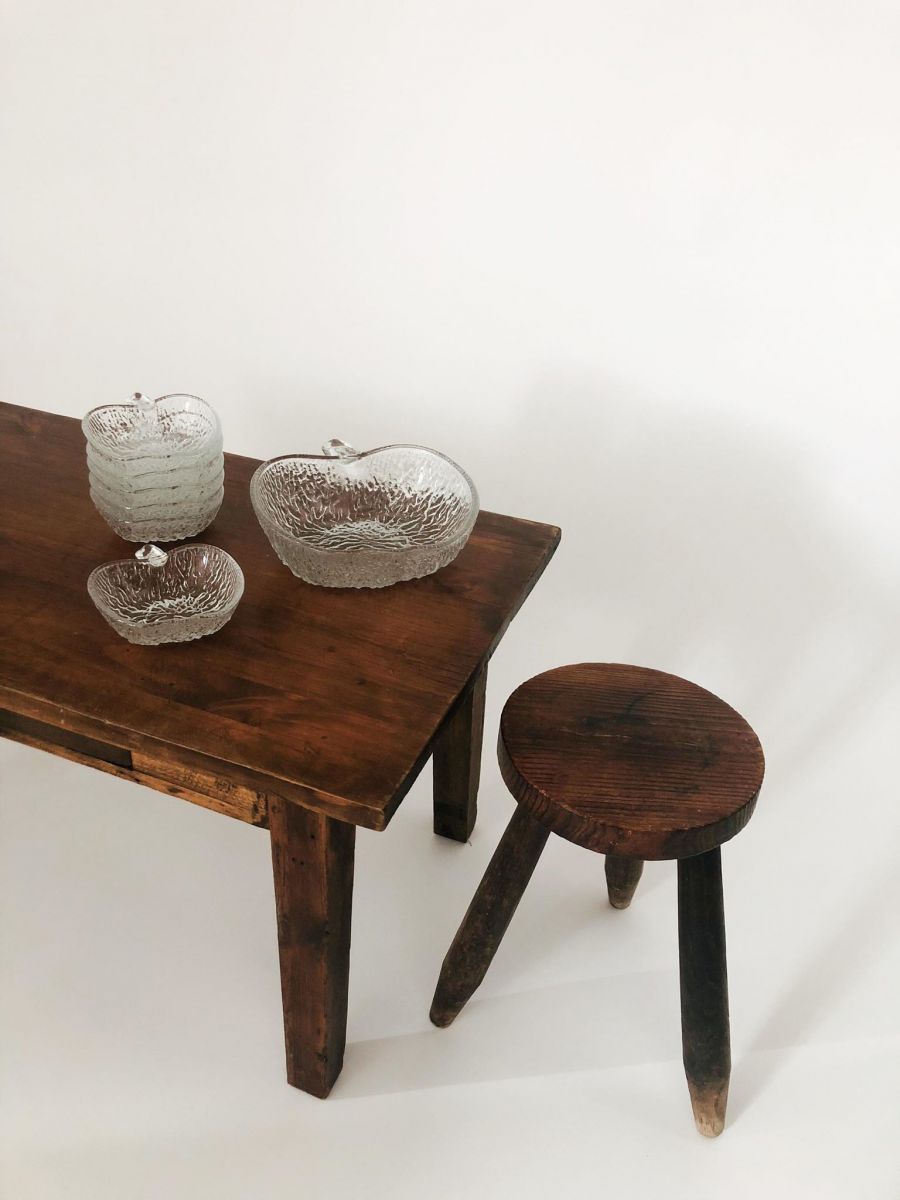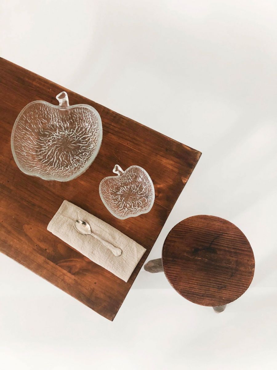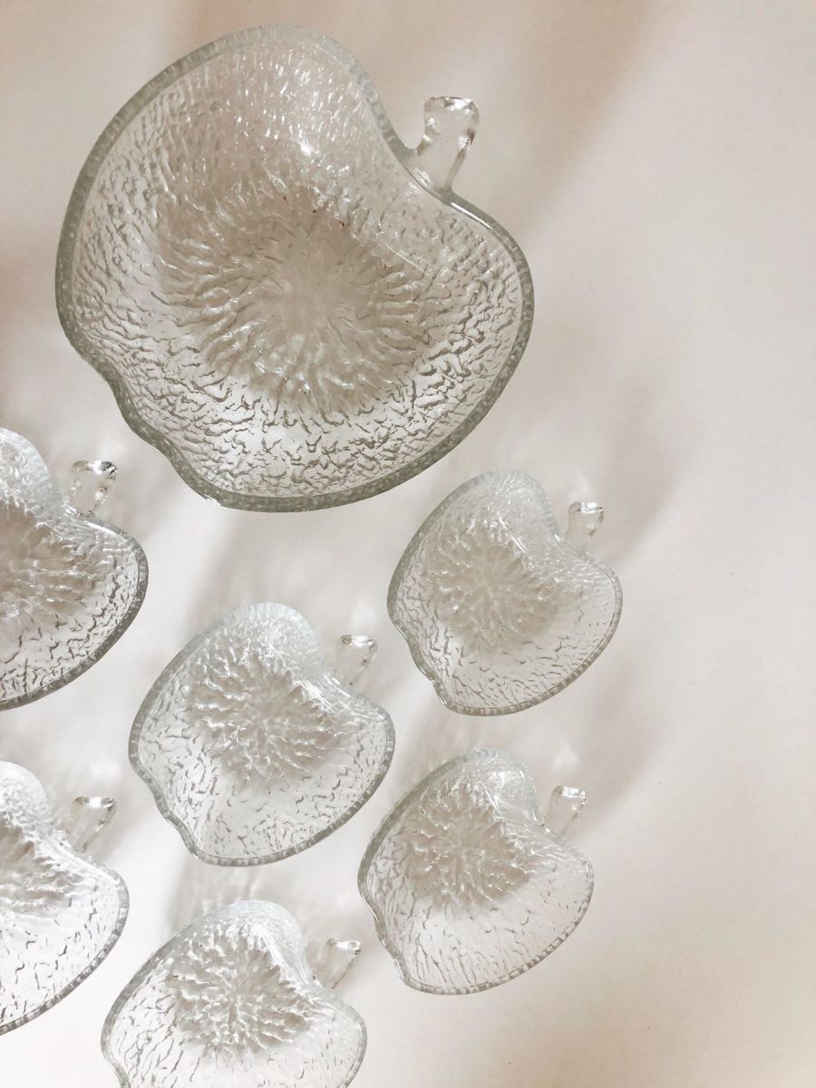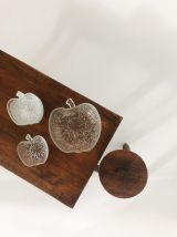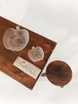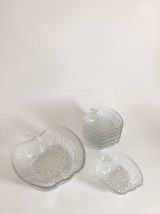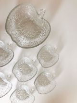 Service à dessert en verre, en forme de pomme composé d'un saladier et de ses 6 coupelles. Idéal pour servir une salade de fruit ou de la glace. Ensemble en excellent état, non cassé ni fêlé. De quoi décorer votre table avec un service chic et vintage. Dimensions saladier h8xl23xla22cm. Dimensions d'une coupelle H5xl14xla13cm.