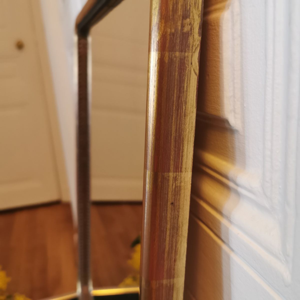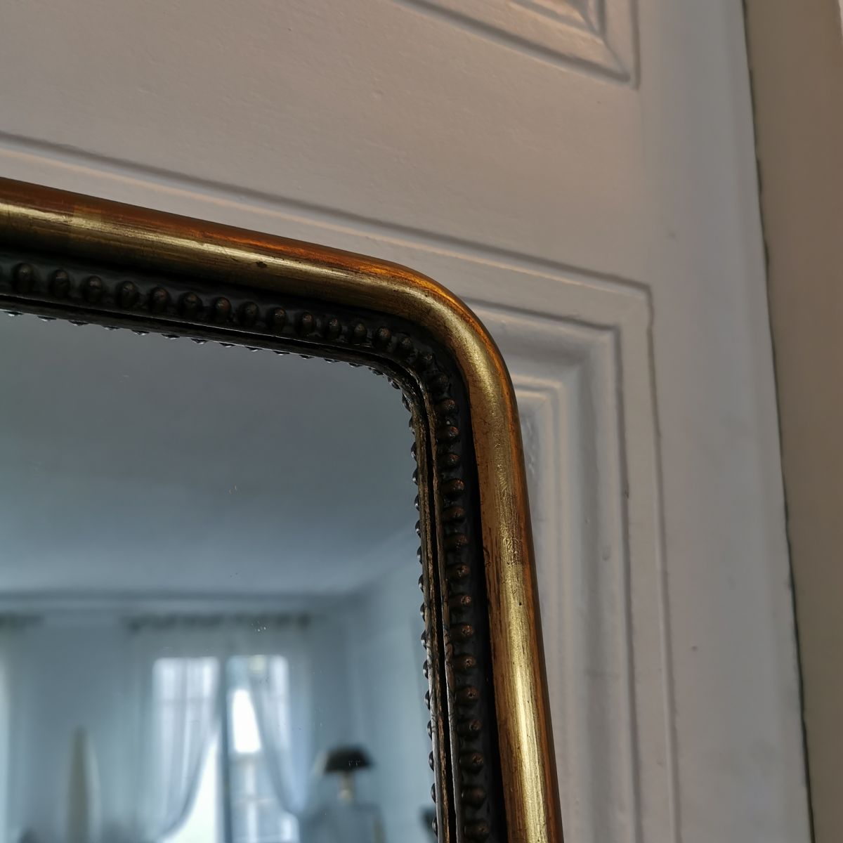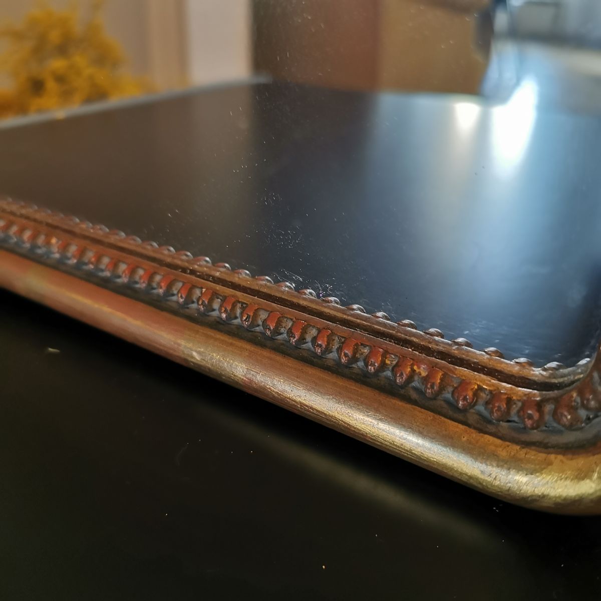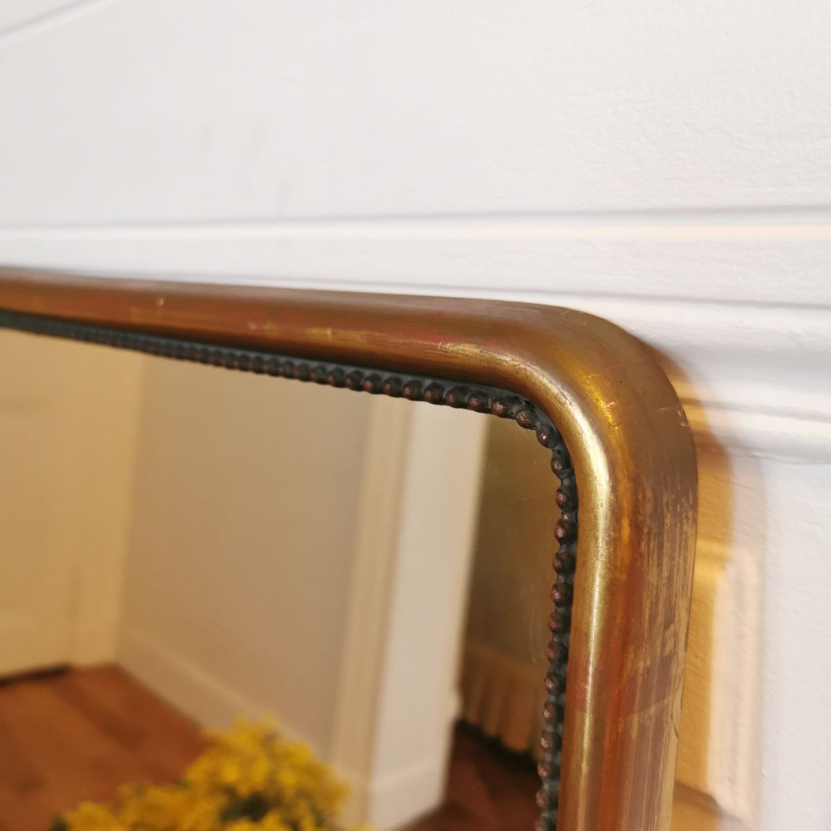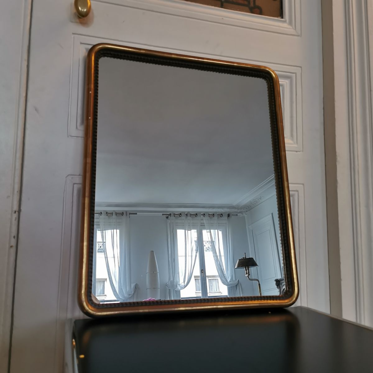 Ancien miroir en bois aux raies de perles d'eaux sculptées avec une jolie patine dorée. Le miroir à des lignes épurées, idéal dans une entrée, des WC, une salle de bains ou pour une coiffeuse. Dimensions H 53 L 43 P 3 cm