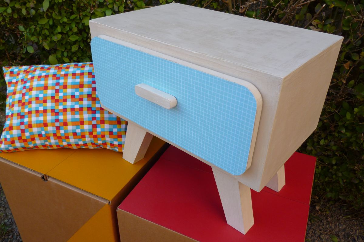 J'ai réalisé ce petit meuble d'appoint à partir de carton ondulé (c'est mon métier!). Il est tout à fait solide et fonctionnel et peut parfaitement convenir comme chevet par exemple. Ou bien être posé sur une commode.