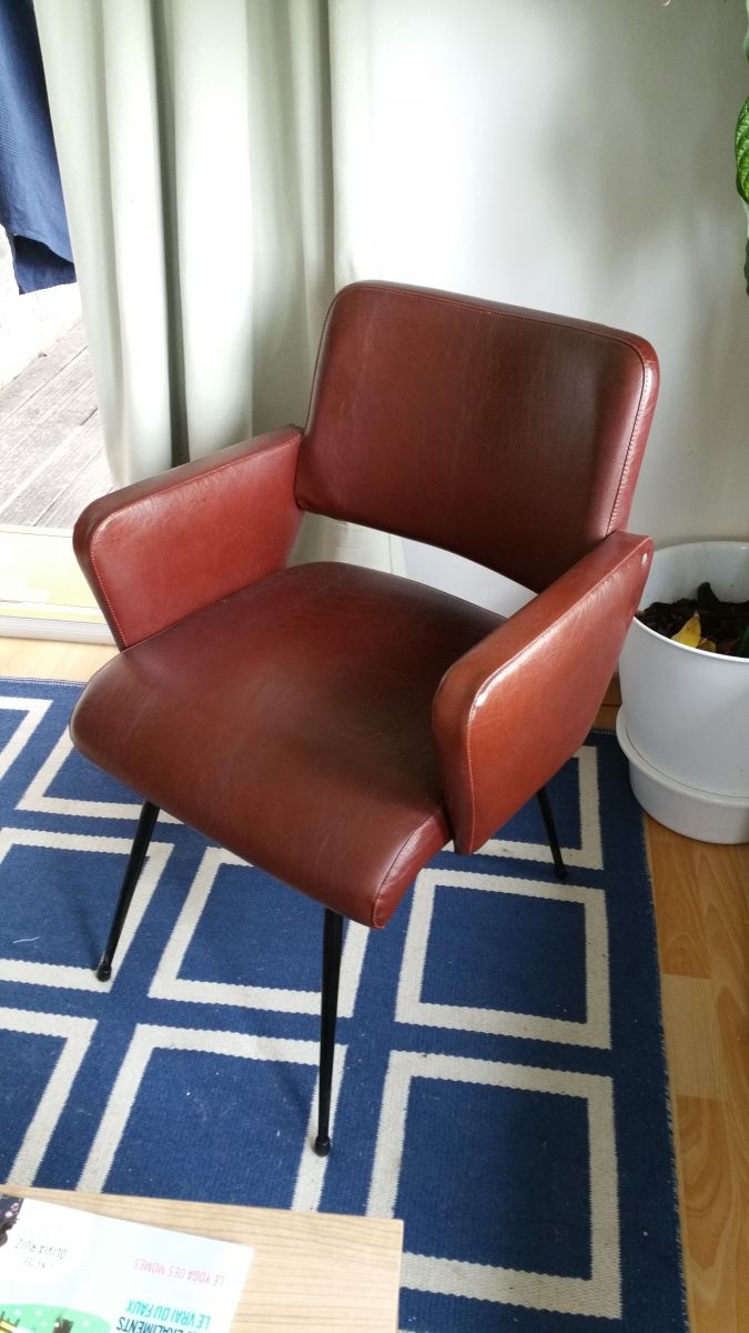 fauteuils vintage années 50 en skai marron, état impeccable (pas d'accroc ni rayures), pieds métal, plaquette d'immatriculation en aluminium dessous, vendu 150 l'unité