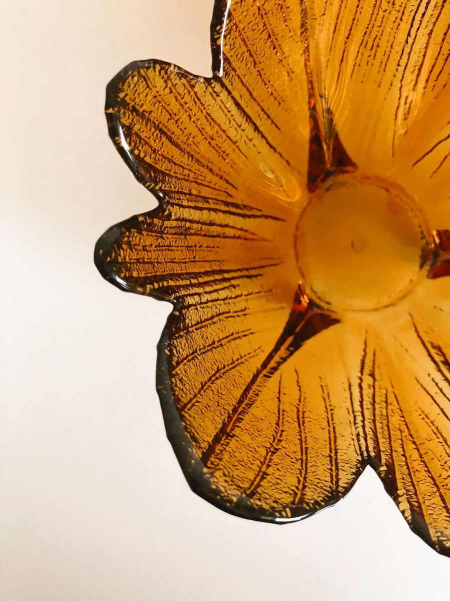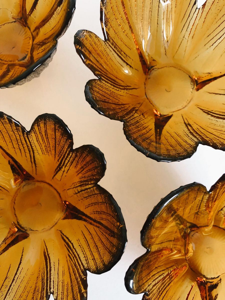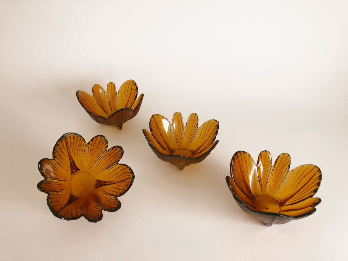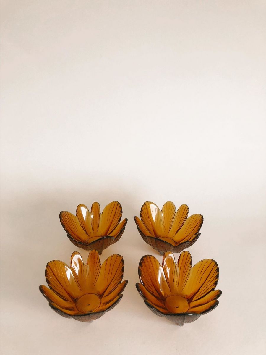 Ensemble de 4 coupelles couleur ambre motif fleur. Très bon état. Très jolie pour servir le dessert. Multiples possibilités! Diamètre 13cm, hauteur 7cm.