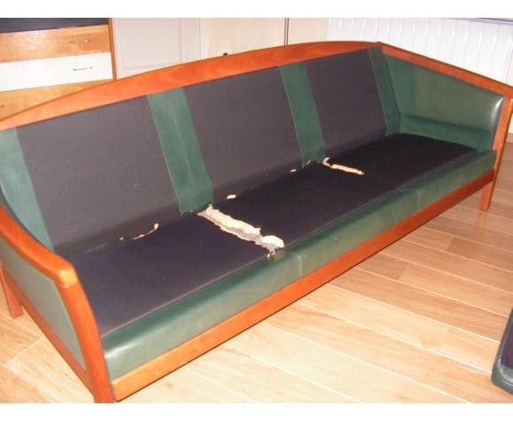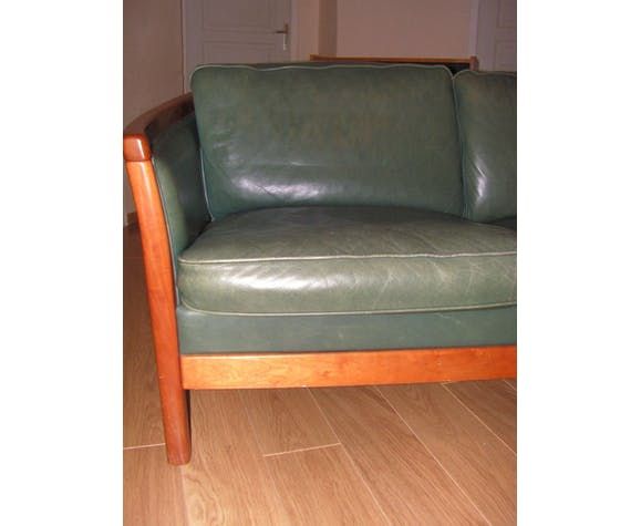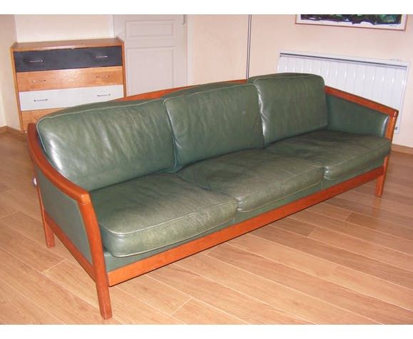 Canapé 3 places danois en cuir vert, patiné par le temps. Sous les coussins la mousse est déchiré ( un tissu pourrait être agrafer) mais le système d'assise est bon. Le cuir épais et souple est à cirer, quelques griffures. Le bois est en bon état. Lignes courbes des accoudoirs .Traces d'usage.