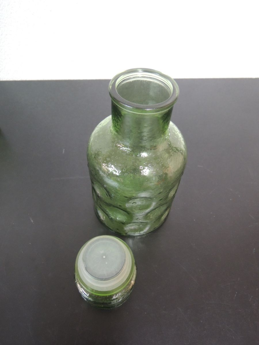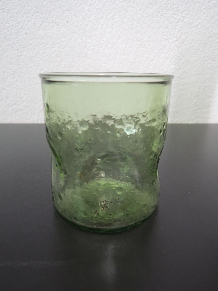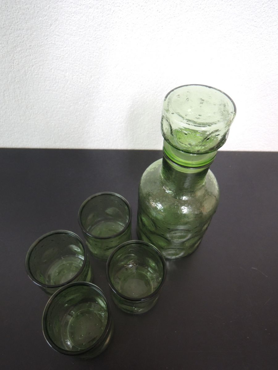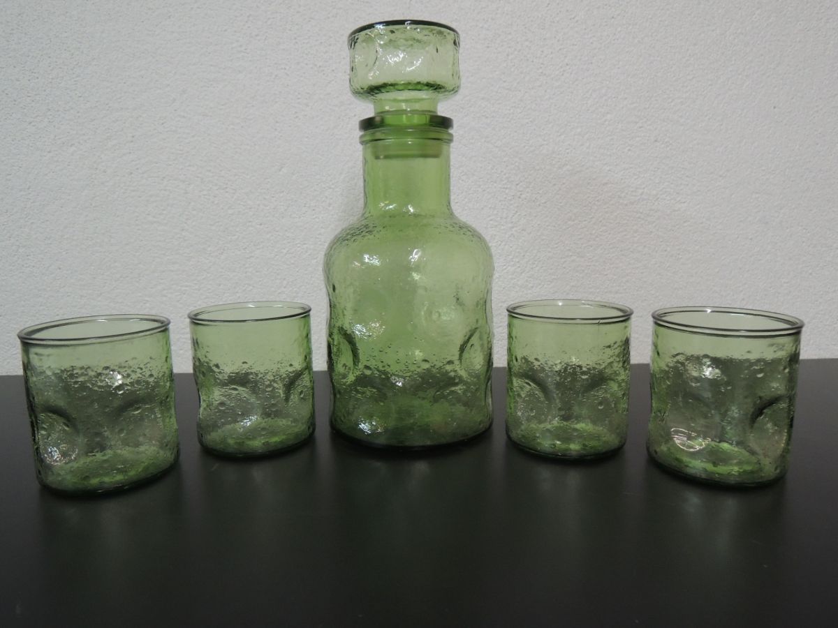 Ensemble composé de 4 verres et d'une bouteille carafe des année 70 en verre moulé avec reliefs en forme de "cratère". Les verres font 7 cm de diamètre et 8 cm de haut, la carafe, d'une contenance de 1 litre fait 25 cm de haut et 11 cm de diamètre. L'ensemble n'a jamais servi.