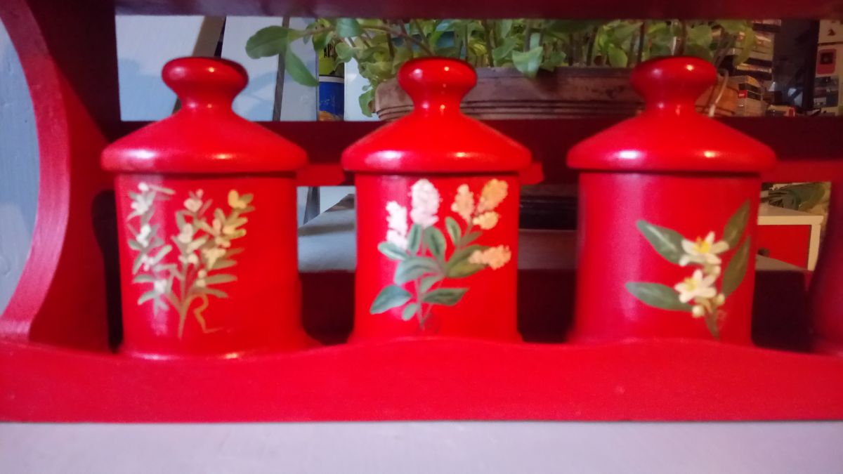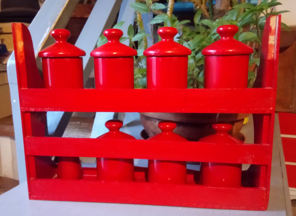 Jolie étagère avec 7 pots à épices et son petit pot probablement à cure-dents. (Elle vient très probablement de Russie)