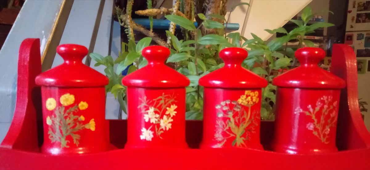 décor fleurs et plantes peint à la main sur chacun des pots.