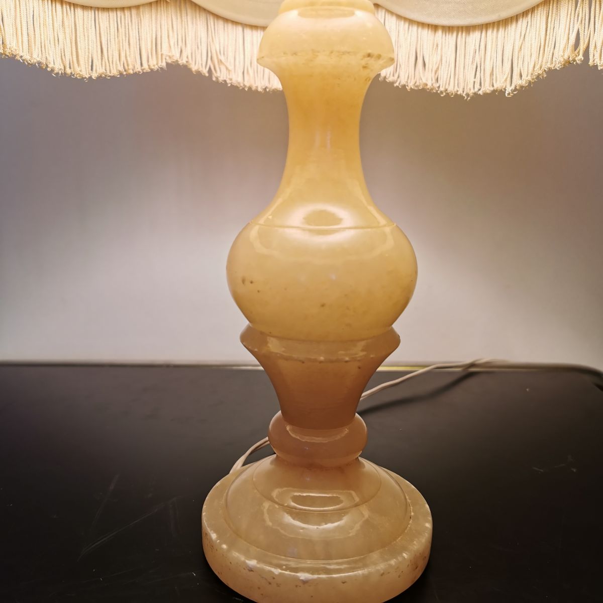 Jolie lampe en albâtre don't le charme est inévitable lorsqu'elle est allumée. La lumière traverse l'albâtre et les franges. La lampe à deux galons dans les teintes de rose. Lampe très poétique et romantique qui donne une atmosphère cosy.