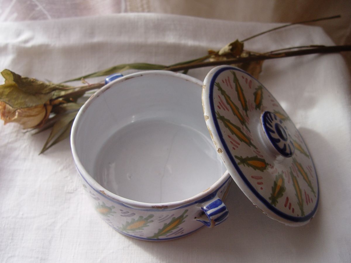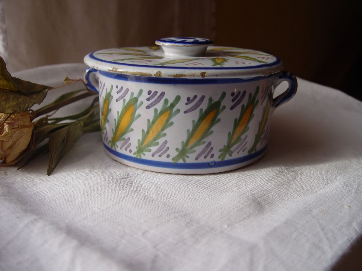 L'état général est bon, quelques petits éclats sur le bord du couvercle (voir photos) ou la peinture vernissée est écaillée une sur le bord du pot également mais cela reste très discret voire invisible quand le pot est fermé.