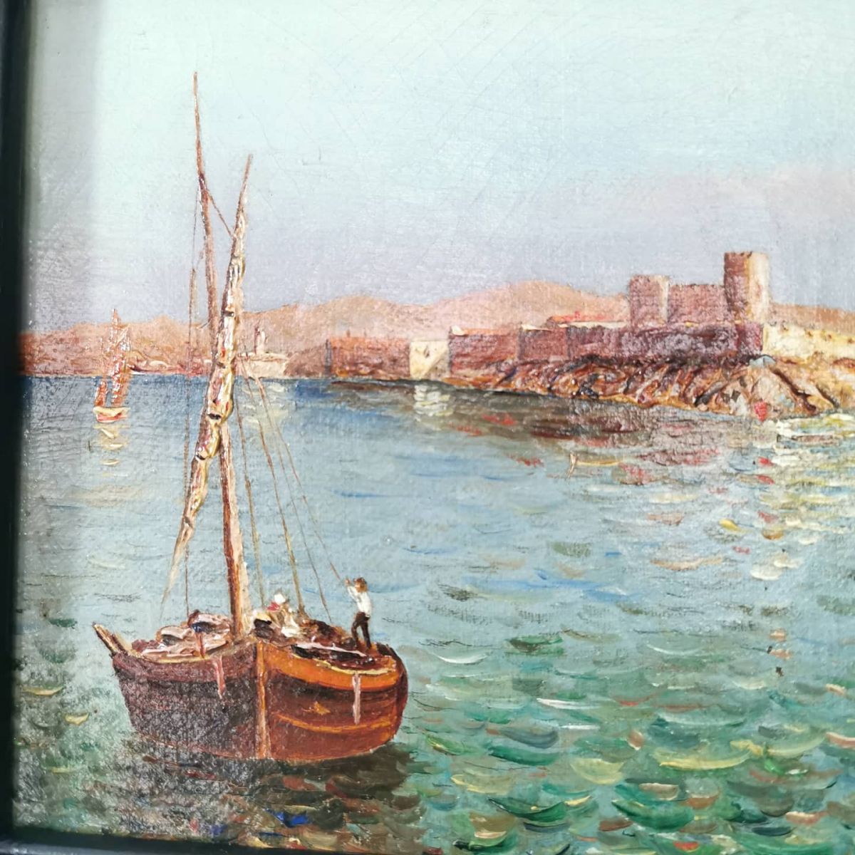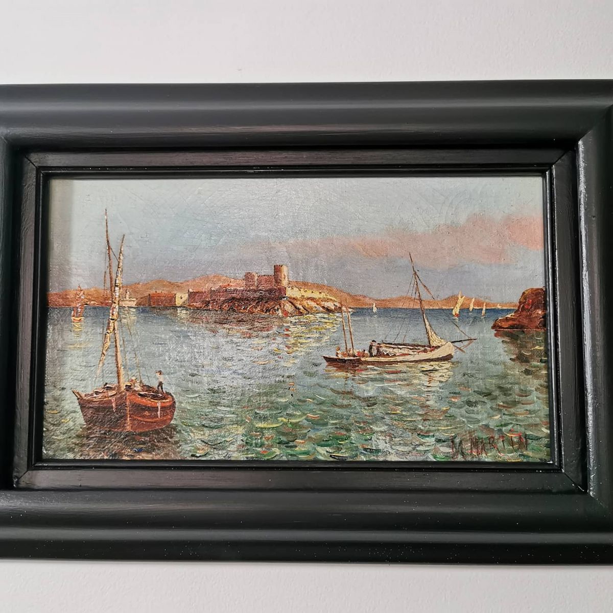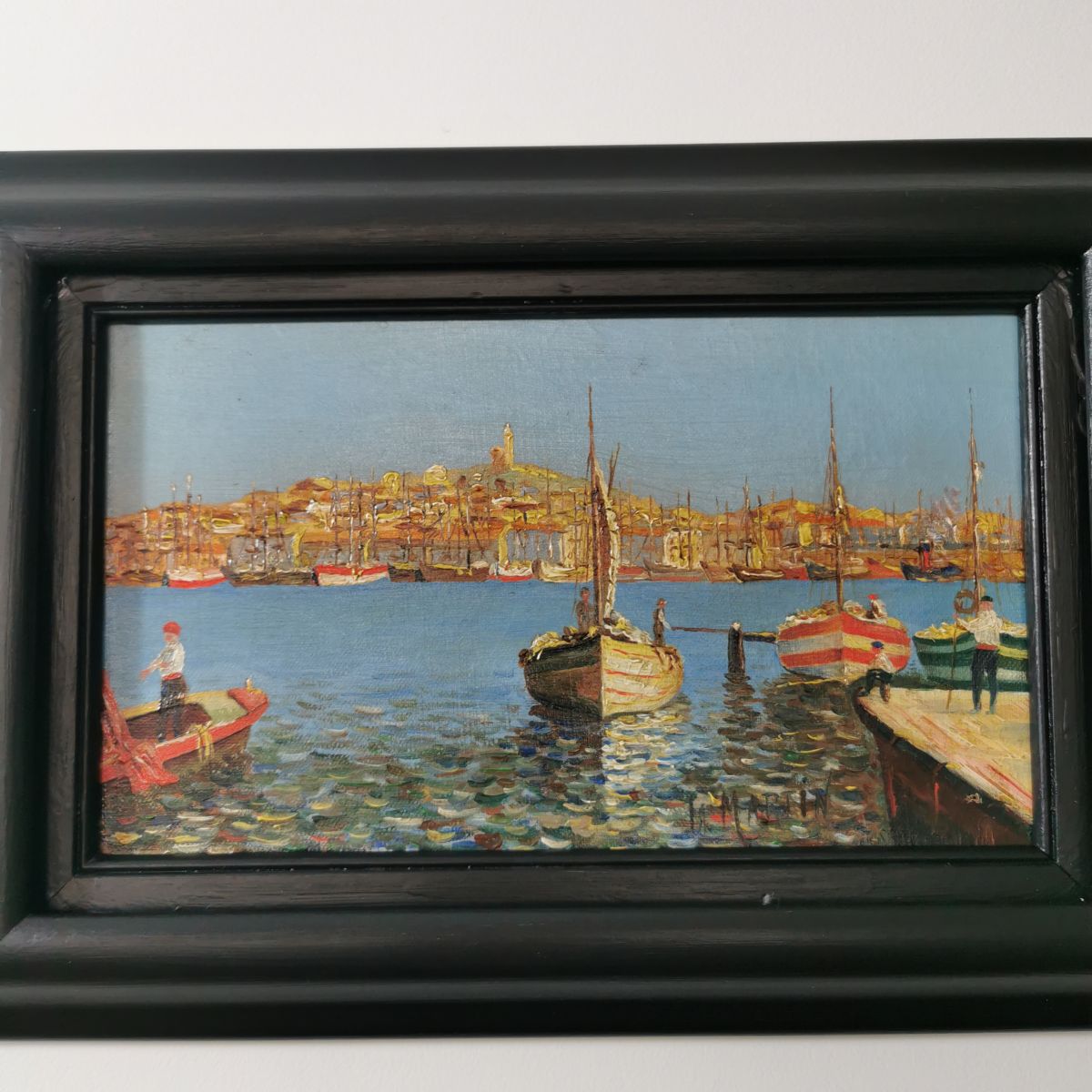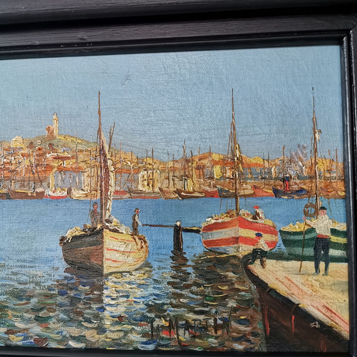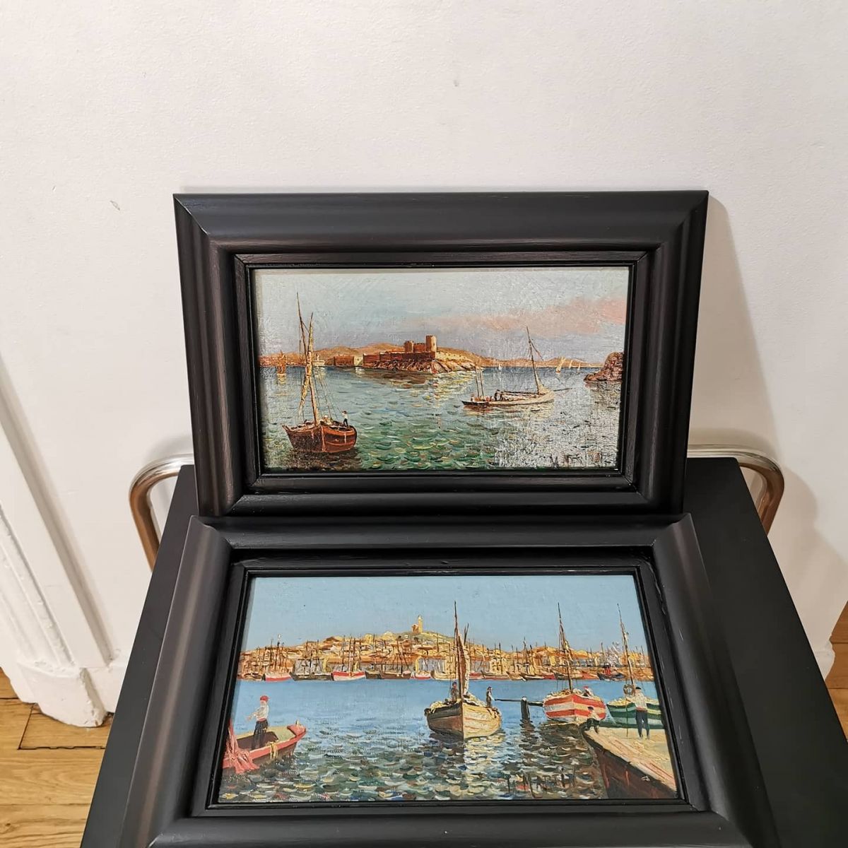 Peintures à l'huile sur toile années 1930 signées Martin. Elles représentent le port de Marseille. Elles sont plutôt de bonnes conservation malgre un tout petit manque (moins de 1mm de diamètre) Les cadres sont en bois vernis noir satiné qui mettent en valeur ces deux peintures. Accroche installée au dos des cadres. Dimensions H 25 L 37