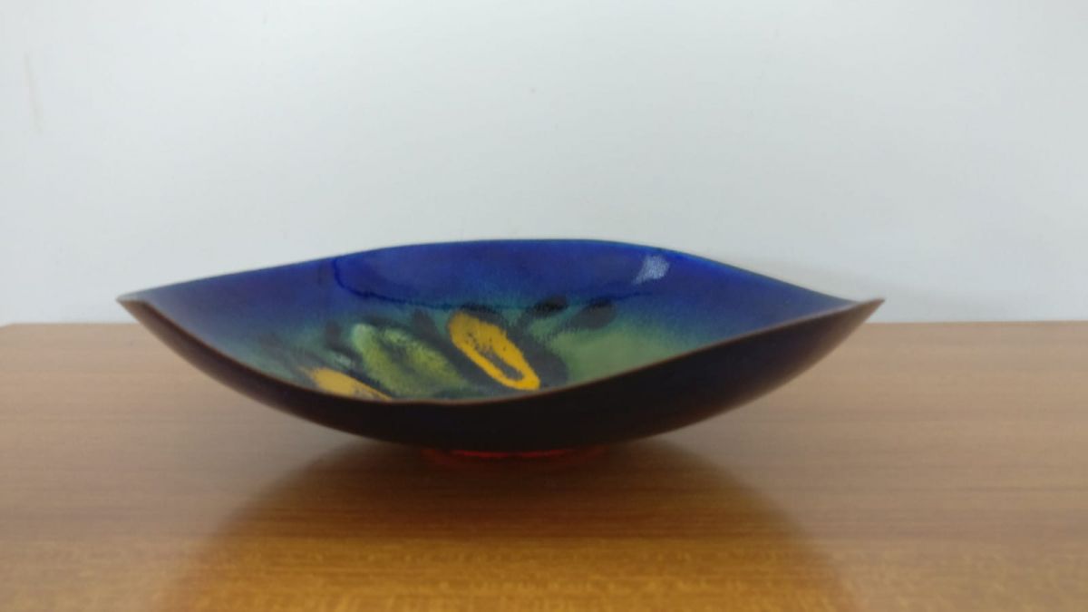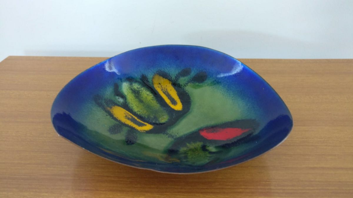 Vide poche en cuivre émaillé des années 60, signé Laurana. Made in Italy. Bon état, légères traces du temps. Dimensions: diamètre max 18cm, hauteur 4cm