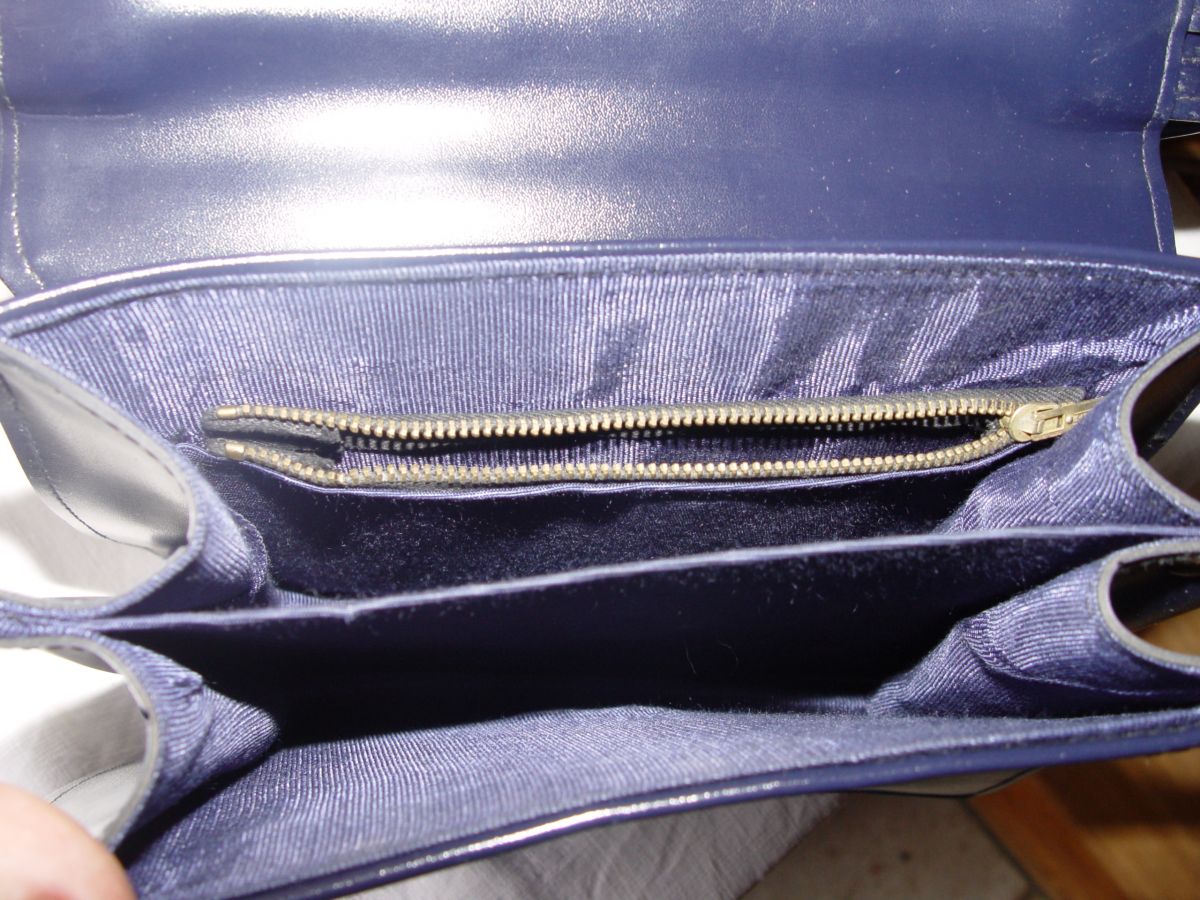 Fermoir doré, 2 pochettes intérieures et une pochette à fermeture éclair.
