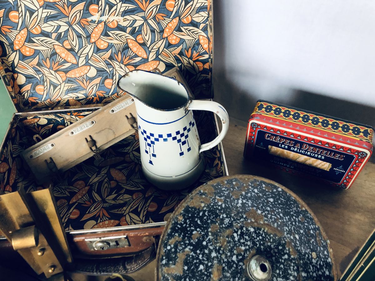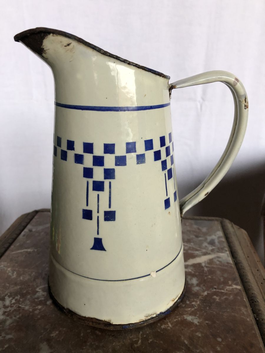 Joli broc émaillé ancien , belle décoration pour y mettre un bouquet de fleurs champêtres par exemple . En bon état , avec quelques traces d'usure qui lui confèrent son côté ancien .