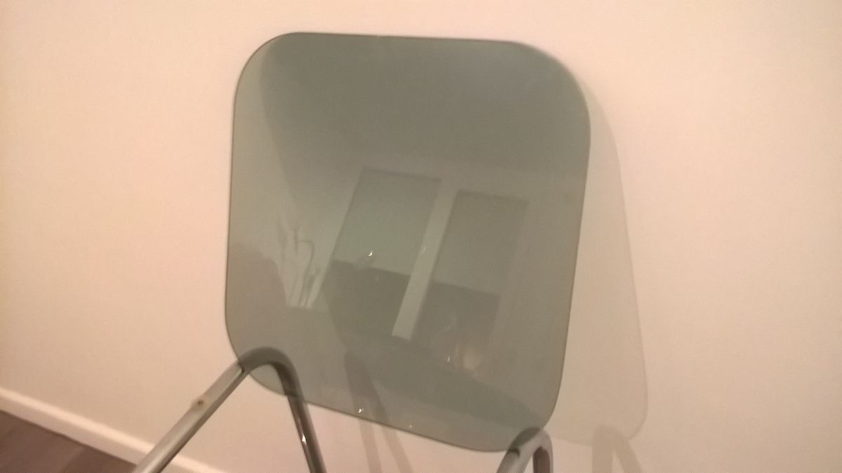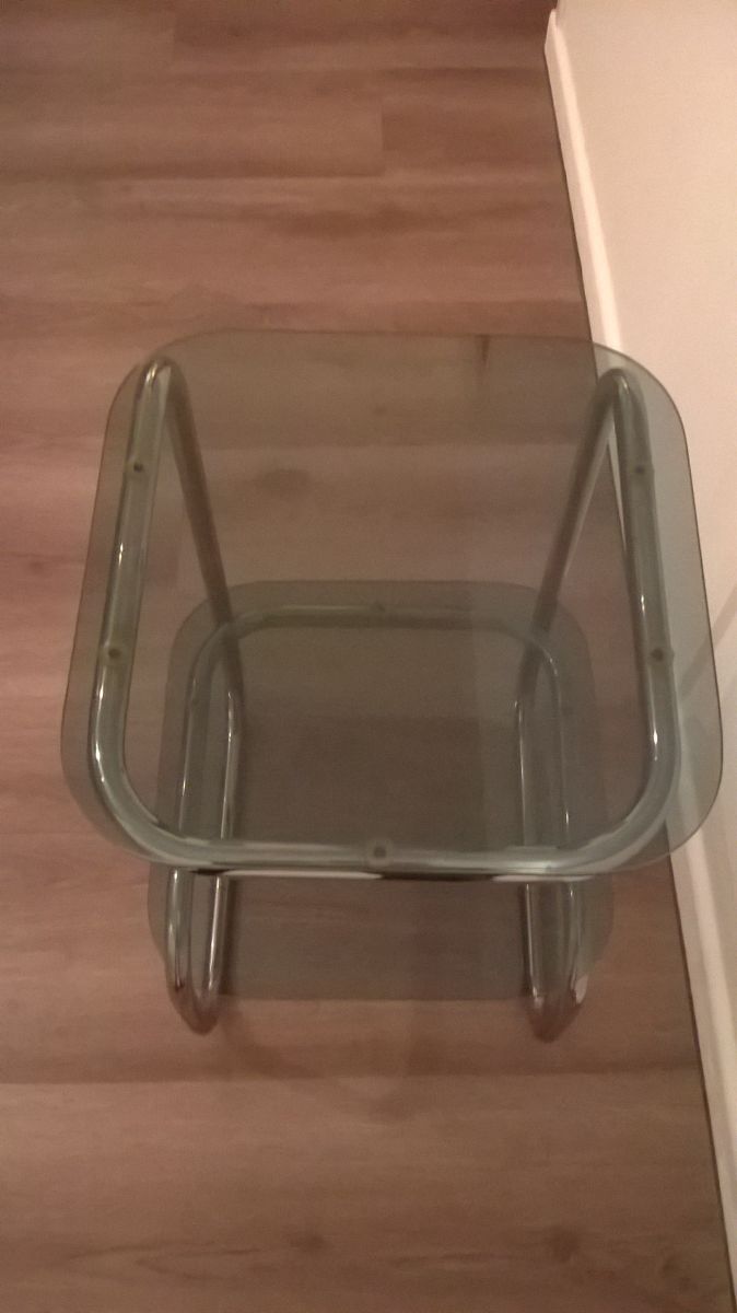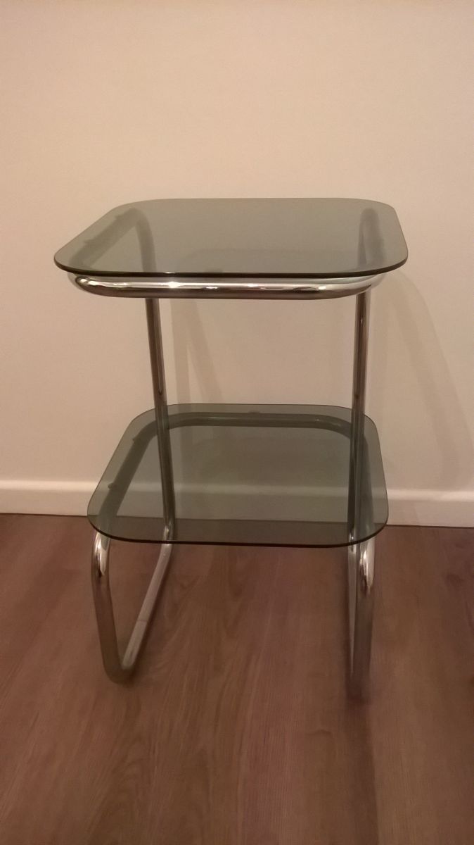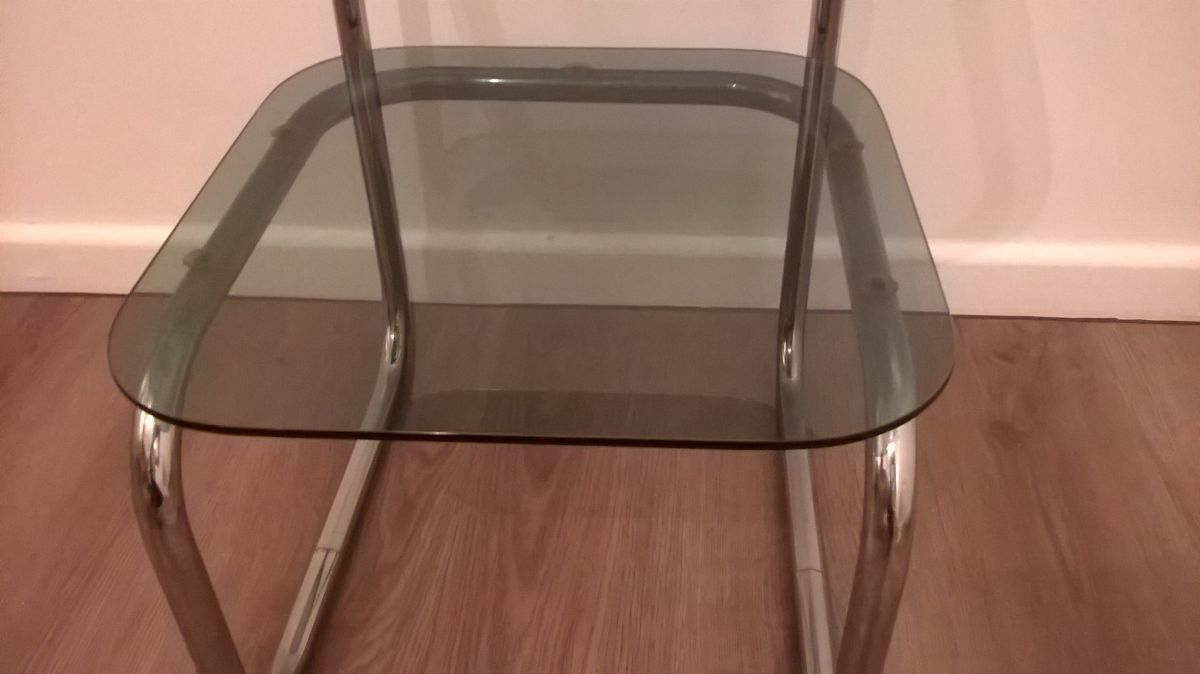 Table d’appoint chrome verre fumé 1970. Plateau en b elle état de conservation. Couleur noir bleuté. Structure métal chromé quelque trace, état très correcte. Hauteur totale 57 cm. Hauteur au premier plateau 27 cm. Format plateaux 35x35 cm.