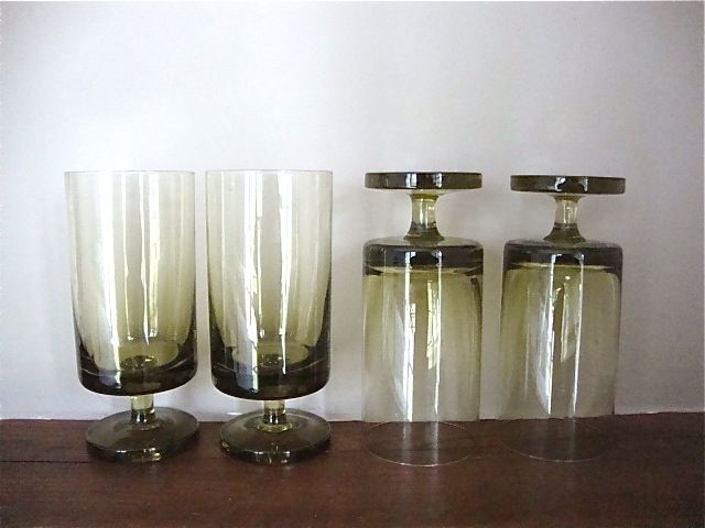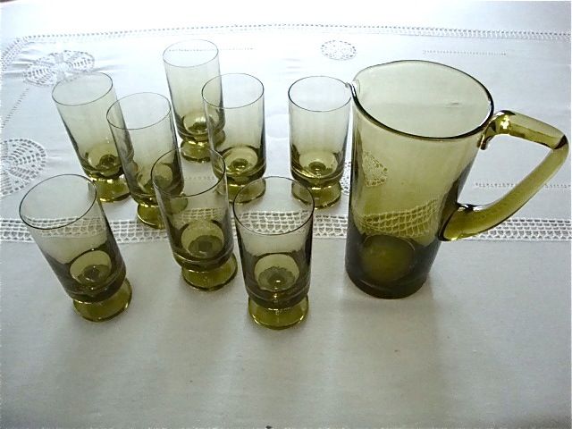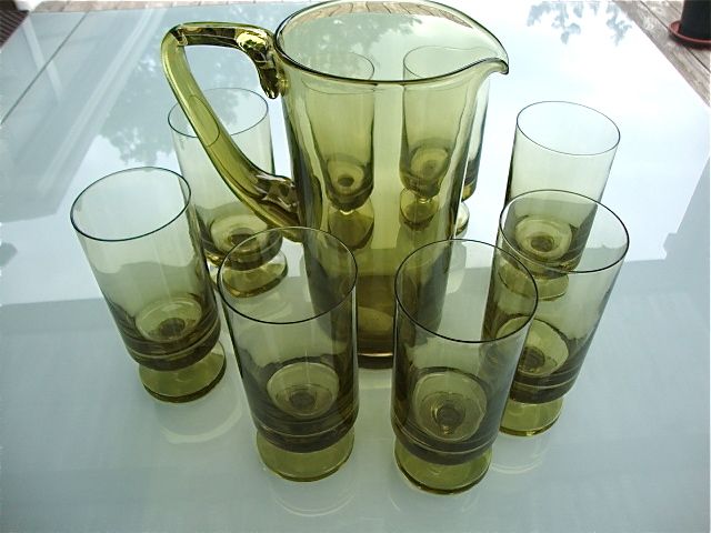 Cet ensemble composé d’un grand pichet et de 8 verres sur pied date des années 60-70. Il est résolument moderne par ses lignes design et sa couleur verte ombrée et fera belle figure pour toutes sortes de boissons et d’occasions.