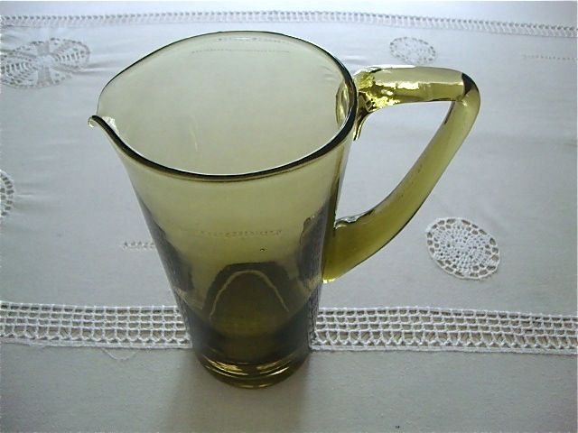 La carafe mesure 24 cm de haut, 12 cm de diam. et 10 cm de diam. au pied. Les verres 16 cm de haut et 7 cm de diam.