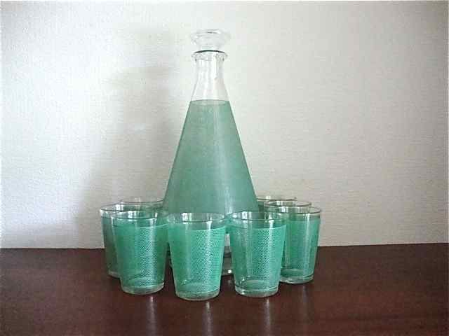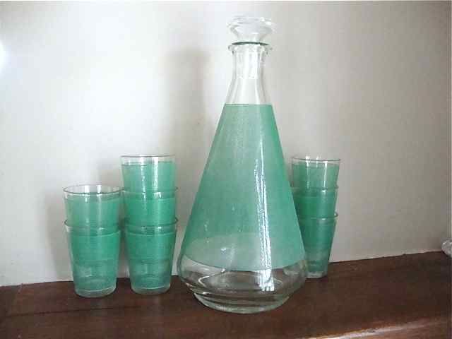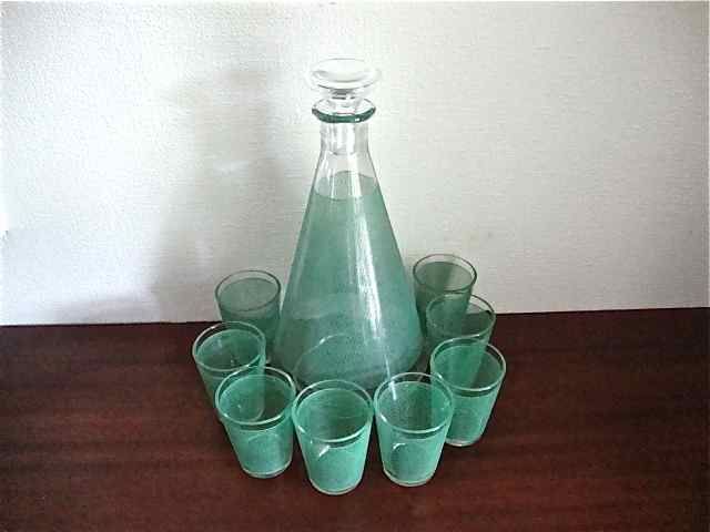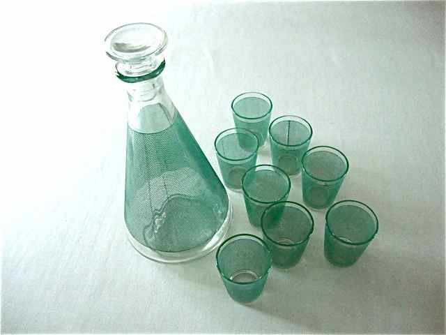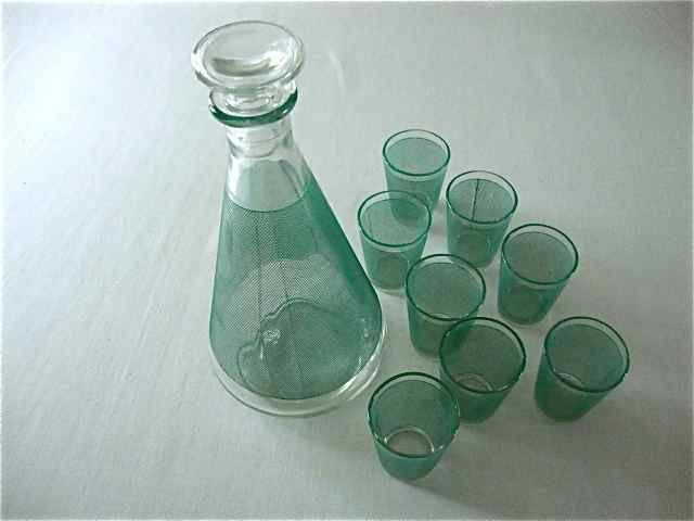Service composé d’une carafe et de 8 petits verres des années 60-70, joliment revêtus d’un treillis vert menthe.