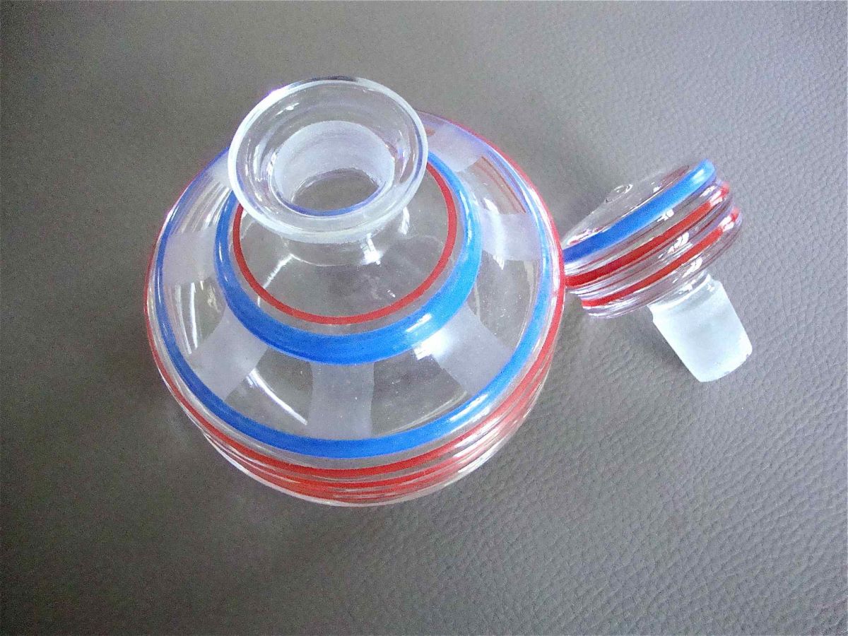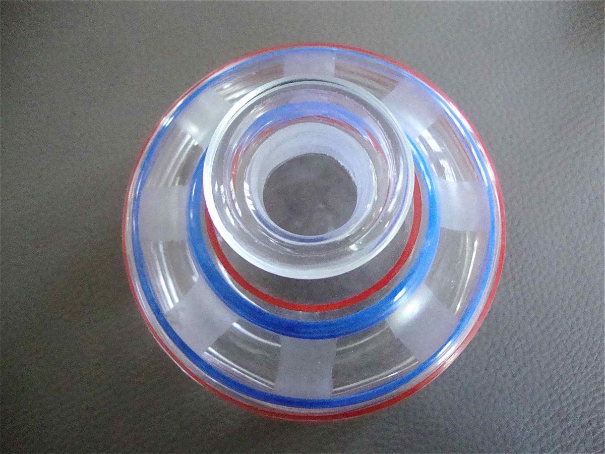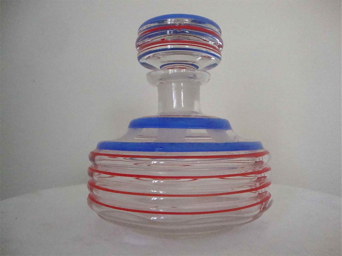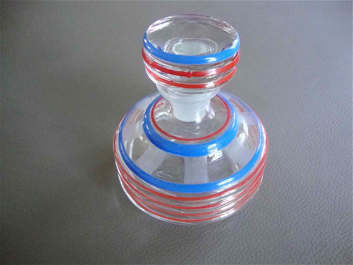 Petit carafon cerclé de rouge et de bleu avec motif gravé autour de la collerette.