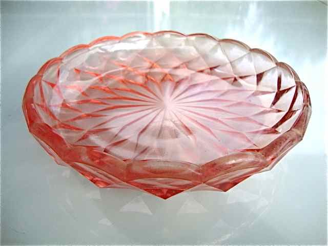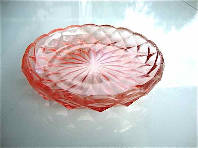 Assiette creuse de service ou vide-poches en verre moulé rose, décor rosace.