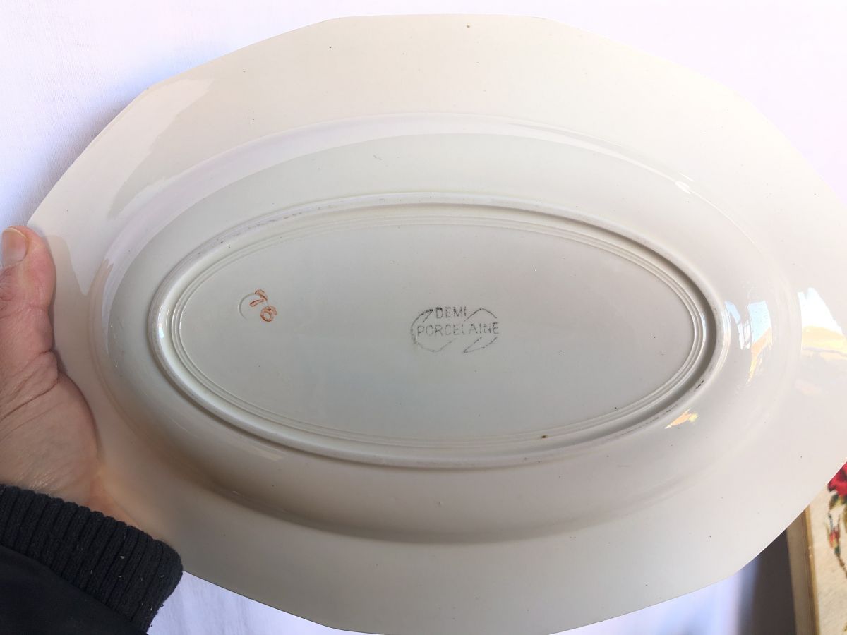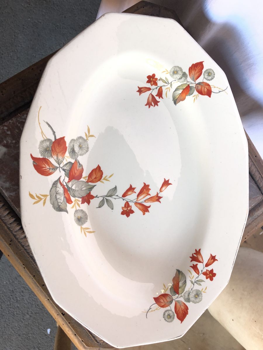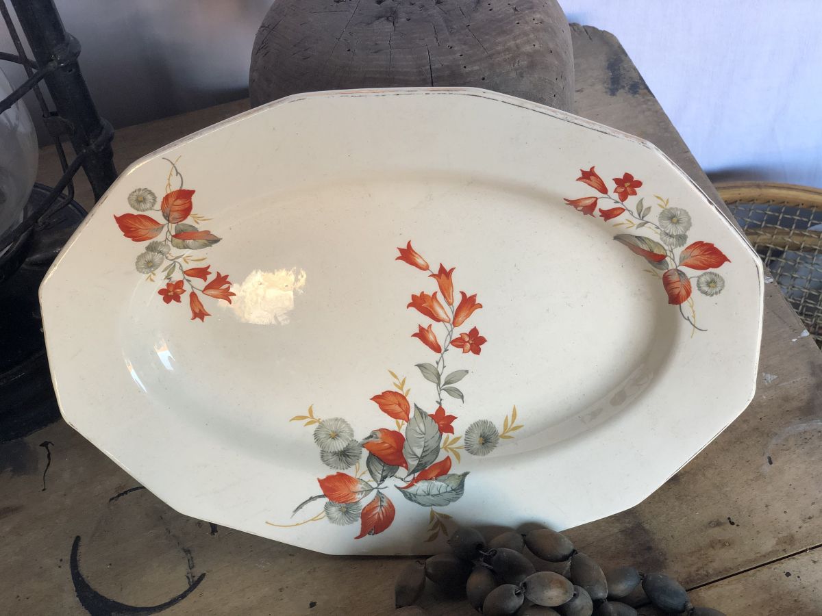 Joli plat de service ,en demie porcelaine (faïence dont la finesse se rapproche de la porcelaine) motifs fleuris dans les tons orangés et gris, très délicats.
