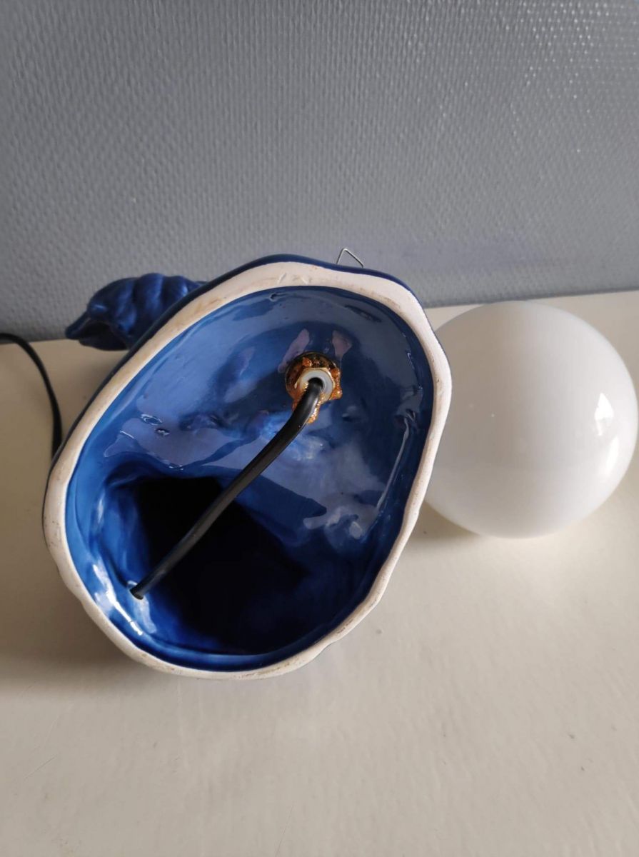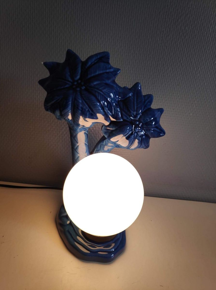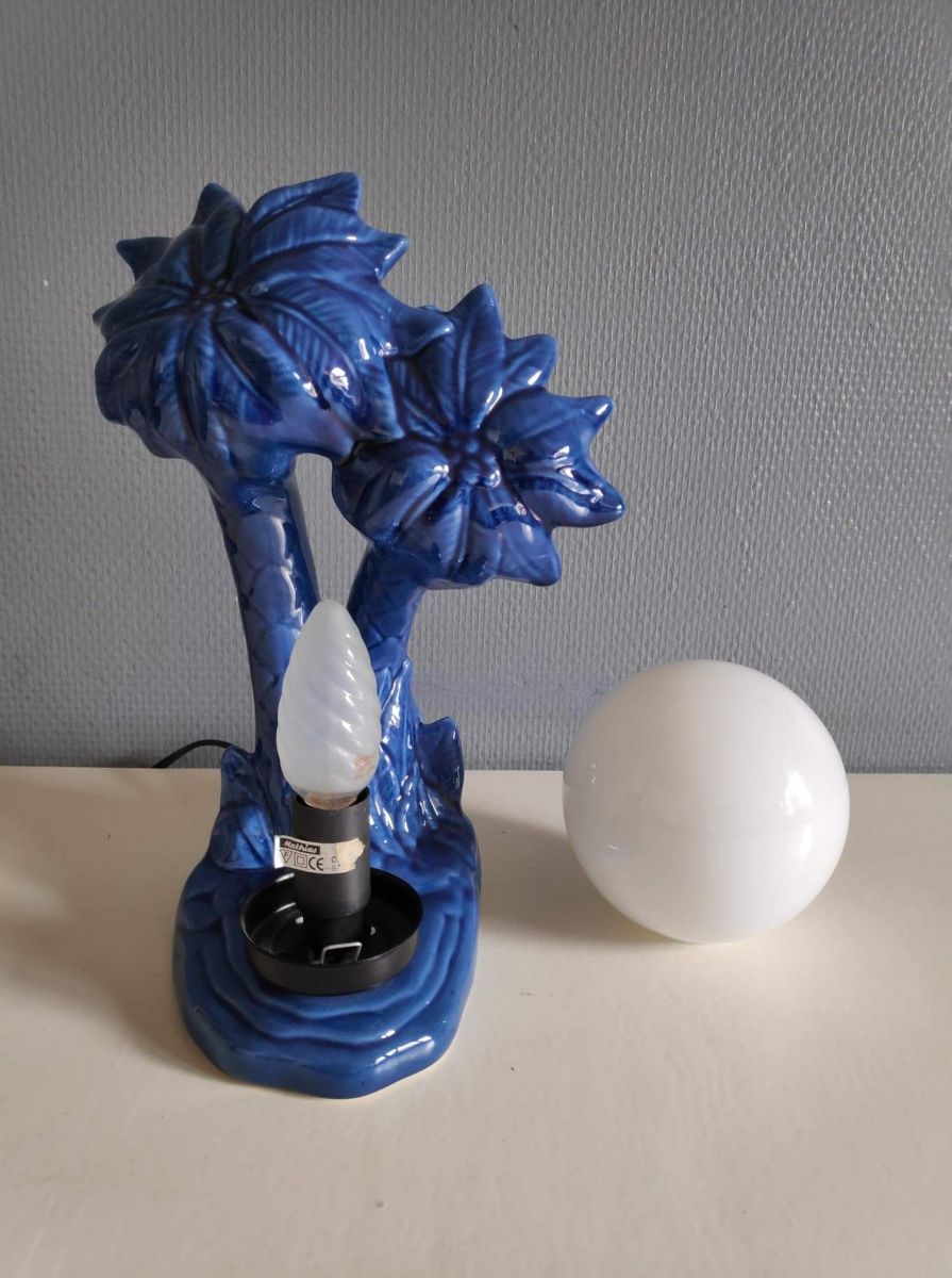 lampe palmiers en céramique bleue et globe opaline blanche des années 80