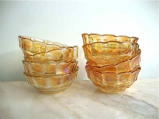 Service saladier et 8 coupelles en verre moulé aux nuances nacrées jaune ambre.