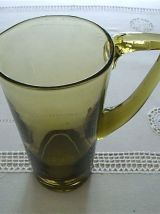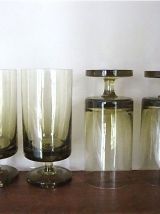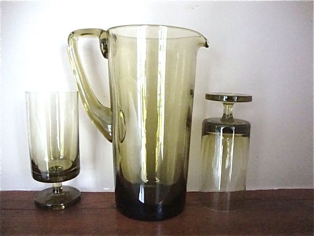 Cet ensemble composé d’un grand pichet et de 8 verres sur pied date des années 60-70. Il est résolument moderne par ses lignes design et sa couleur verte ombrée et fera belle figure pour toutes sortes de boissons et d’occasions.