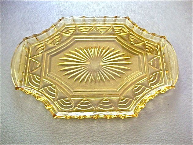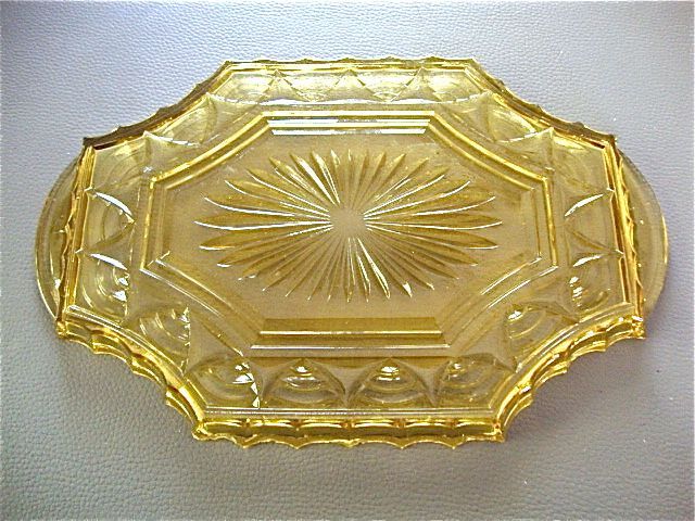 Modèle typique de plateau en verre moulé jaune datant des années 50-60. Il est en excellent état, tout en conservant les petits défauts mineurs de fabrication inhérents au verre moulé ancien.