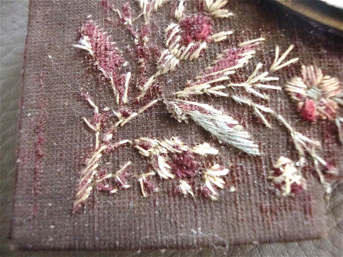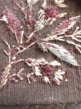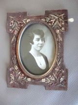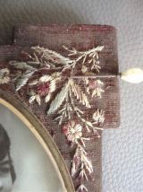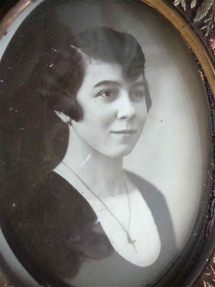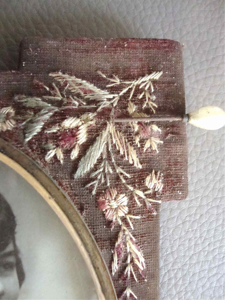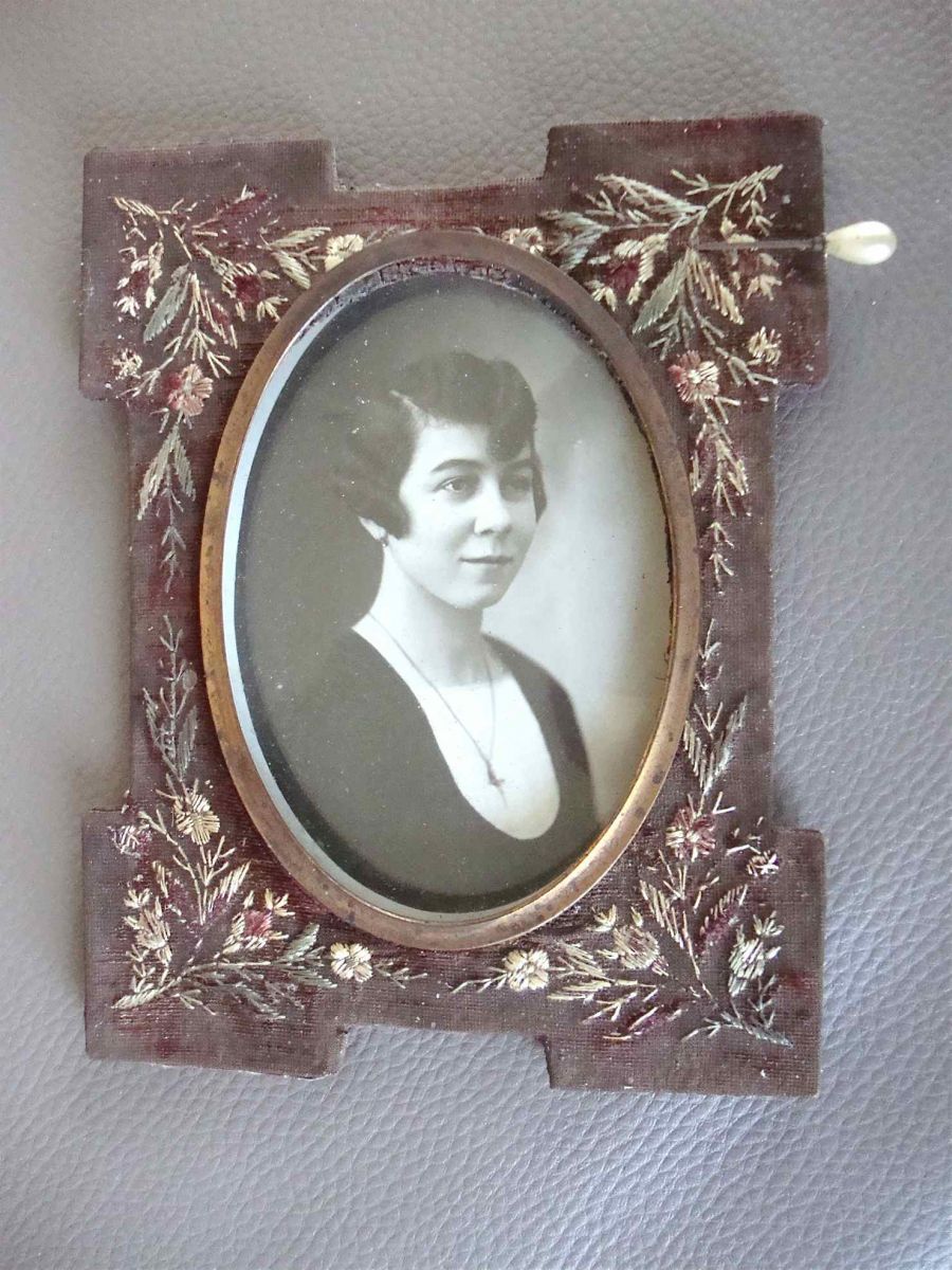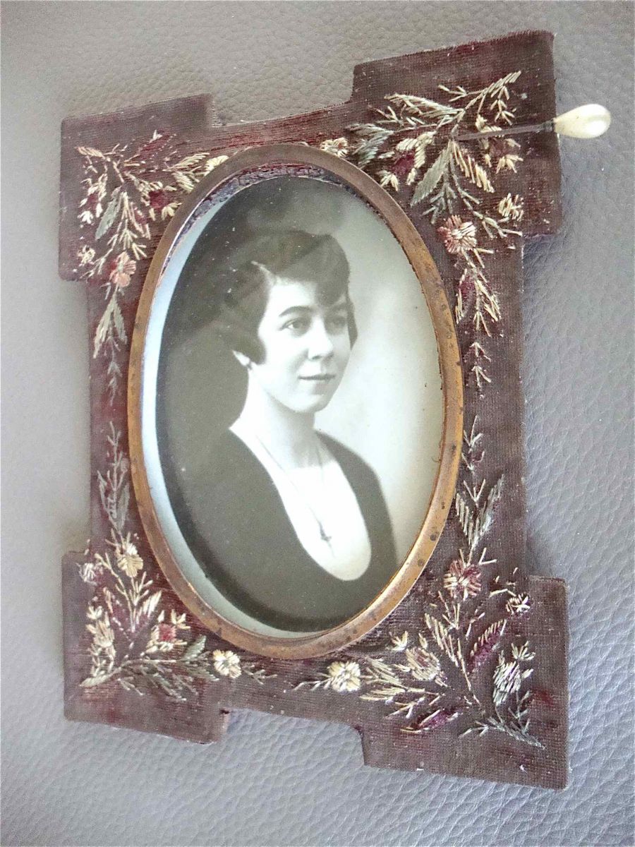 Portrait de jolie jeune femme des années 30, coiffée à la garçonne, dans un cadre finement brodé sur une toile contrecollée. Son épingle à chapeau est restée là où elle l’avait placée. Petit moment d’émotion.